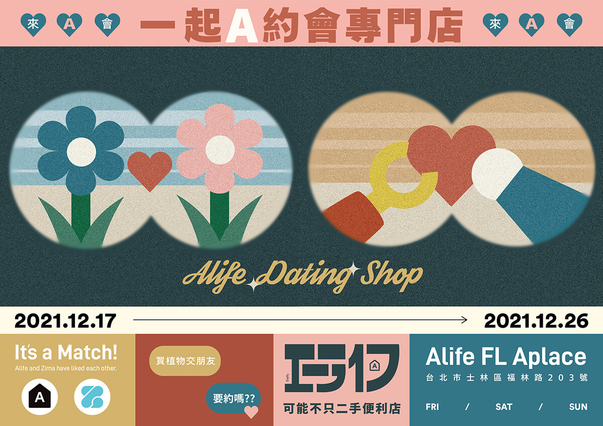 Alife|提供各種生活解決方案。從生活企劃提案、多型態的生活空間 ,到回應時代的生活服務。透過Alife,把生活過成想要的樣子。今年年底(12月)現正舉辦「一起A約會專門店」,邀請各位逛植物店、交朋友、淘二手好物,一起發現生活的新可能。報名活動請按此