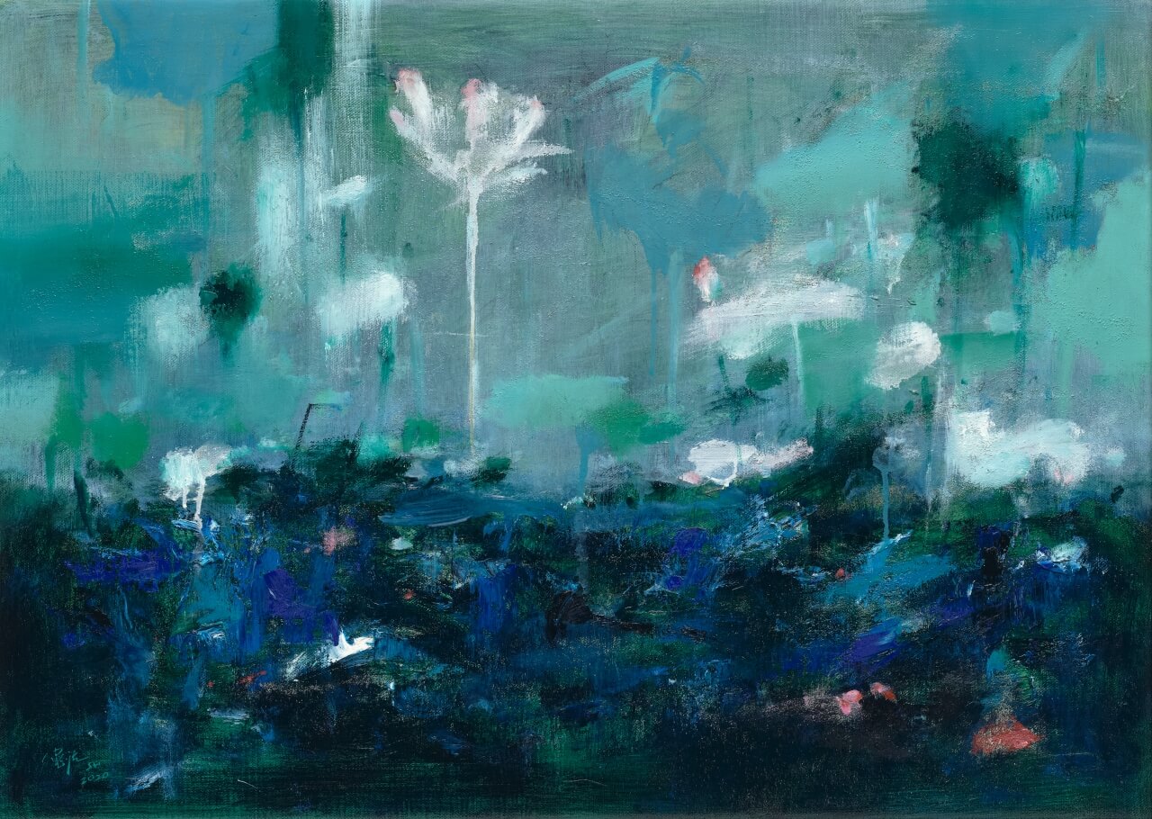 台灣當代藝壇重量級人物,台灣美術院院長蘇憲法教授,以〈四季〉為題創作一系列精品佳作。其中《墨荷心影》作為代表作之一,以深邃的藍黑色調為主,呈現出水中倒映荷花或水面漣漪的效果,融合東方水墨意境與西方抽象藝術的表現張力,讓觀者彷彿置身於如夢似幻的靜謐荷塘之中。