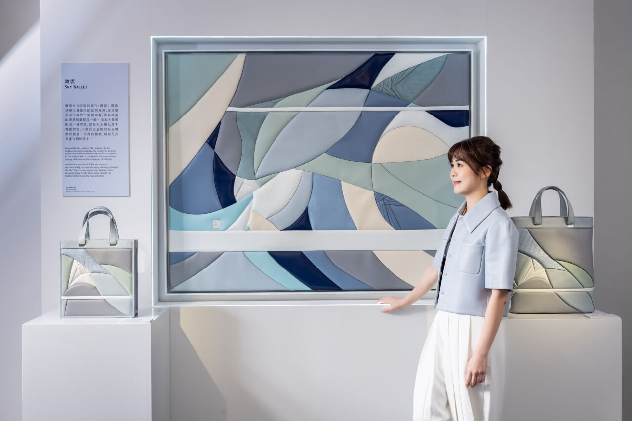 王思涵將堅韌的皮革轉化為如水般流動多變的型態,著重探索水與光影之美。「包是背在身上的皮革畫作,畫作是展翅飛揚的皮革包款」,透過皮革包與皮革畫的互相呼應,理性與感性、動靜相融的平衡,完整呈現其創作初心不受表象框限的藝術意涵。呈獻《舞雲 Sky Ballet》、《流,與波光 Glistening》、《海,與曙光 Glimmer》以及《湖,與窗 Lake and Window》系列作品。其中,《舞雲 Sky Ballet 00》是一幅大型皮革掛畫,靈感源自母親的畫作《躍動》,透過精湛工藝與獨特的視覺層次,捕捉暴風雨的猛烈洶湧,同時呈現出水平線的平衡與寧靜,將狂暴能量凝結在一個精彩瞬間,王思涵的皮革藝術作品不僅展現了對材質的深刻理解與精湛技藝,更體現她對自然之美的獨特詮釋。
