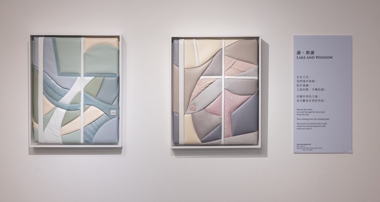 本次展覽的一大亮點,是新銳藝術家王思涵帶來的皮革藝術創作。作為倫敦藝術工藝皮件品牌 Grace Han 的創辦人,王思涵以「 2 」 傳達一體雙生的創作概念,以皮革作為顏料揮灑,開創兩種獨特的藝術形式:經典皮革包款與前所未見的皮革畫創作,將精湛工藝延展至畫作與包款之間。