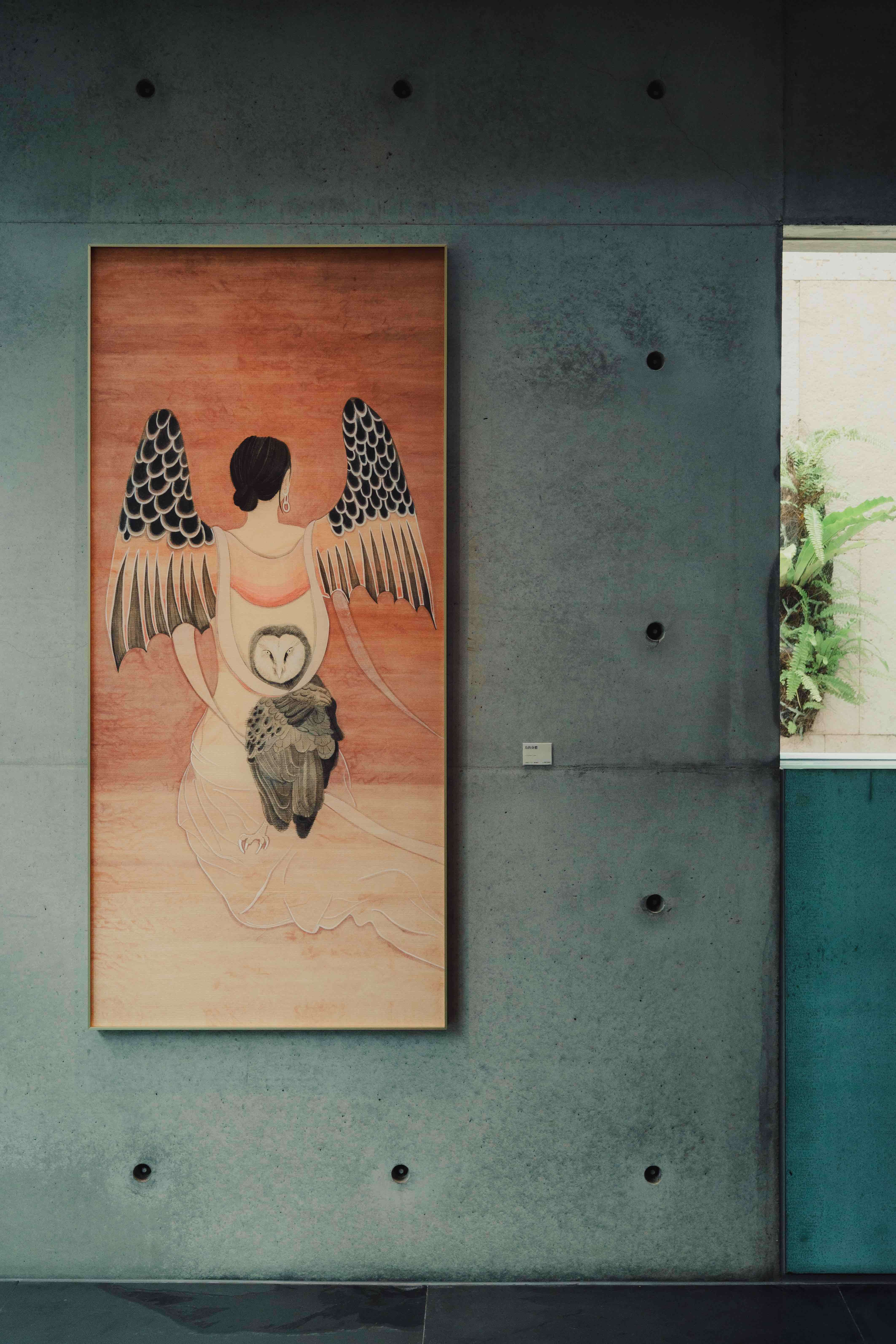 因此她所描繪的女性人物,帶有東方文化對女性神明的想像,並加入了來自埃及、美索不達米亞等古文明的女性神祇形象,以及神話裡常出現的符號,如羽翼、獸首、繭狀身體——象徵女性力量的流動性與自我再生。這樣的視覺語法,使她的創作不僅是個人生命的書寫,更是文化符號的再生與重組。