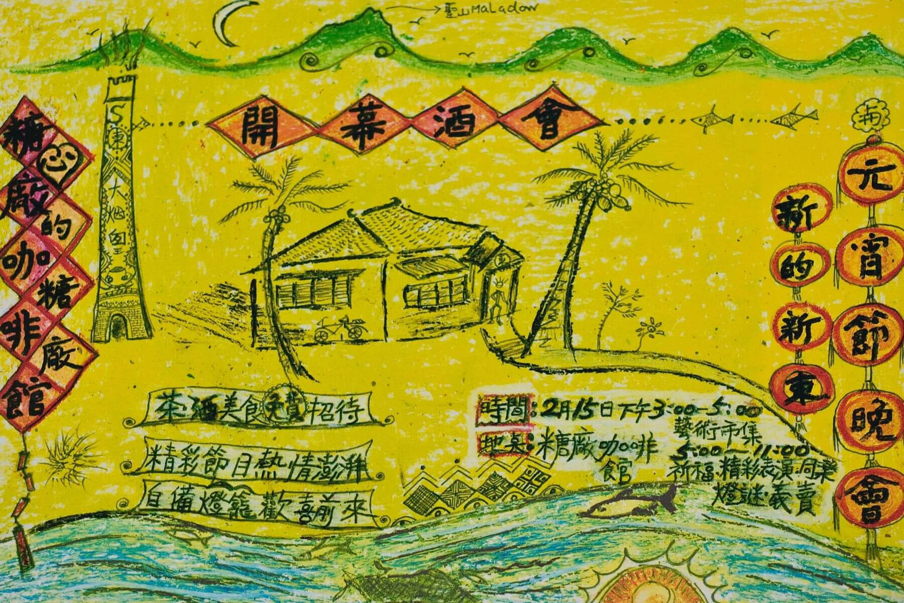 阿才為都蘭糖廠咖啡屋開幕親繪的文宣_逗小花提供