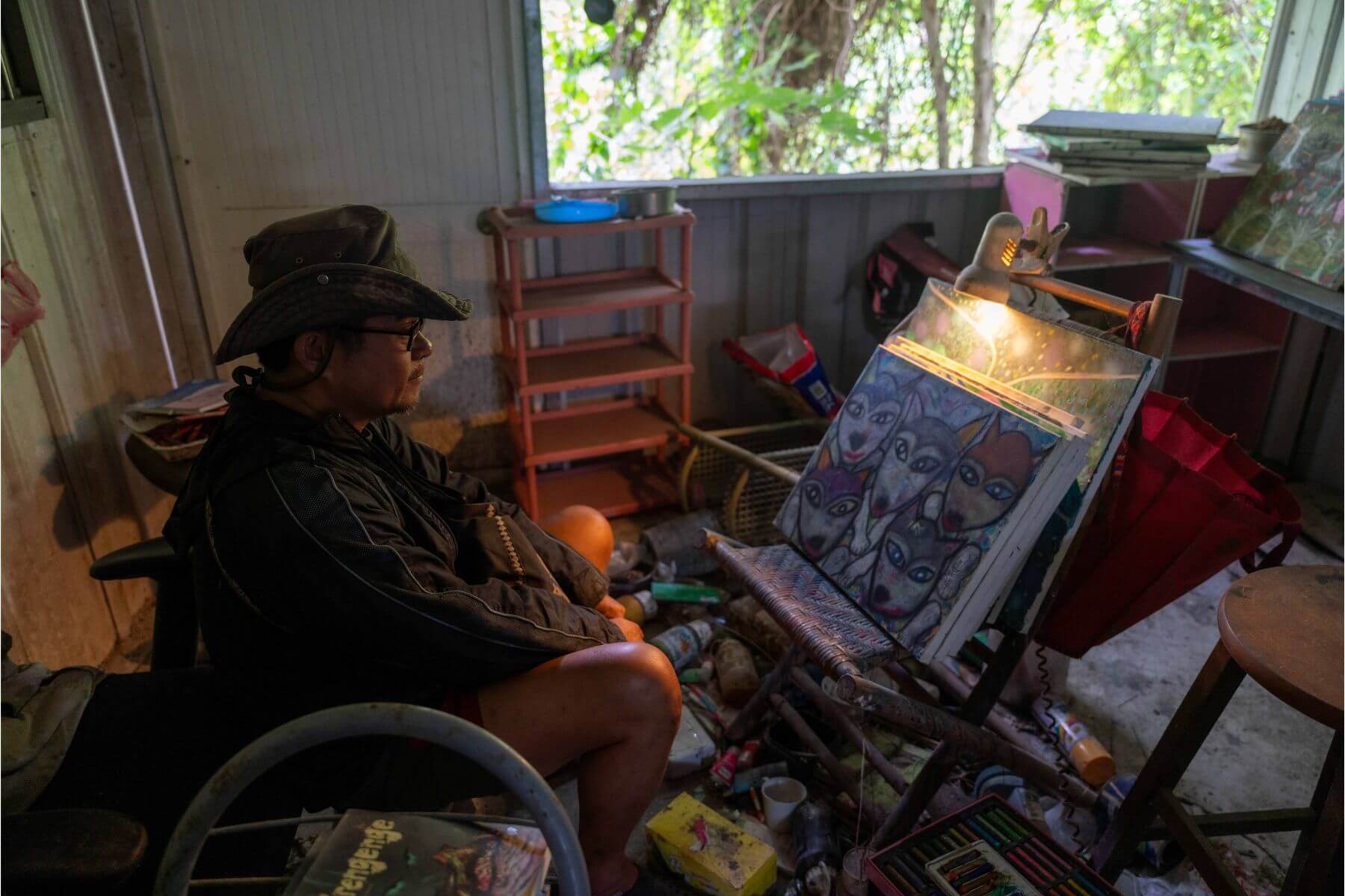 現在王家祥最主要的創作表達不再是寫作,「年輕時因為過度投入寫作把自己折磨到身心焦慮失調好多年,現在年紀越來越大了沒體力,寫作需要耗費大量的時間和精力投入,一隻狗救下來至少要養七、八年,每天處理都蘭狗園的事情,時間被切割得很碎,更無法專注於寫作。」他的創作抒發完全地轉向畫畫,「狗園忙完後就開始畫畫,畫到晚上沒有畫完,帶回家再畫。畫畫讓我覺得自己仍有生產力。」為了方便攜帶和郵寄,他多是以壓克力顏料畫在八號大小的畫布上,作品Po在臉書上展售。畫的主題大部份是融合真實與想像的風景,和他身邊最重要的夥伴流浪貓和狗兒,雖然他自謙偶爾才能賣出去一張畫,但目前為止生活剛好過得去,「還好還養得起狗,也會去市場收集免費的肉骨、去雞精工廠拿剩下的雞骨頭。我最高紀錄是同時照顧一百多隻狗,所幸現在外來移民多,動保意識提升,願意帶狗結紮的人也比較多了,動保團體願意辦理下鄉結紮,讓我們的壓力變少許多。」然而依然有源源不絕救不完的流浪動物啊!