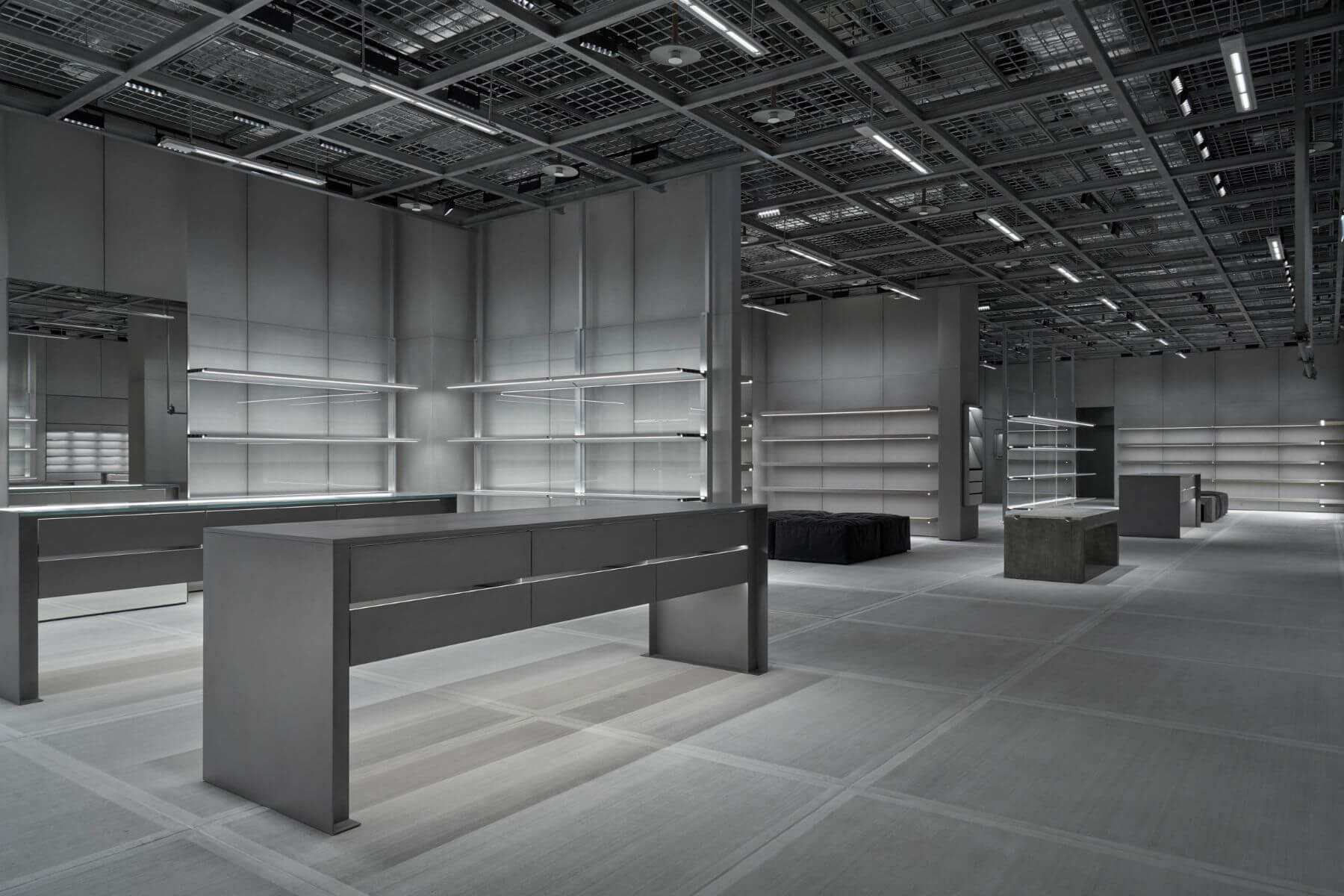 與台北101明亮大器的室內設計形成強烈對比,Balenciaga概念店展現粗獷仿舊的建築感,店內天花板上懸掛工業風金屬網架,地板以拋光混凝土製造出有如人行道磁磚的外觀,創意總監Demna以此象徵著時間流逝與不復往返的昨日,也引人反思何謂純粹?何謂真實?