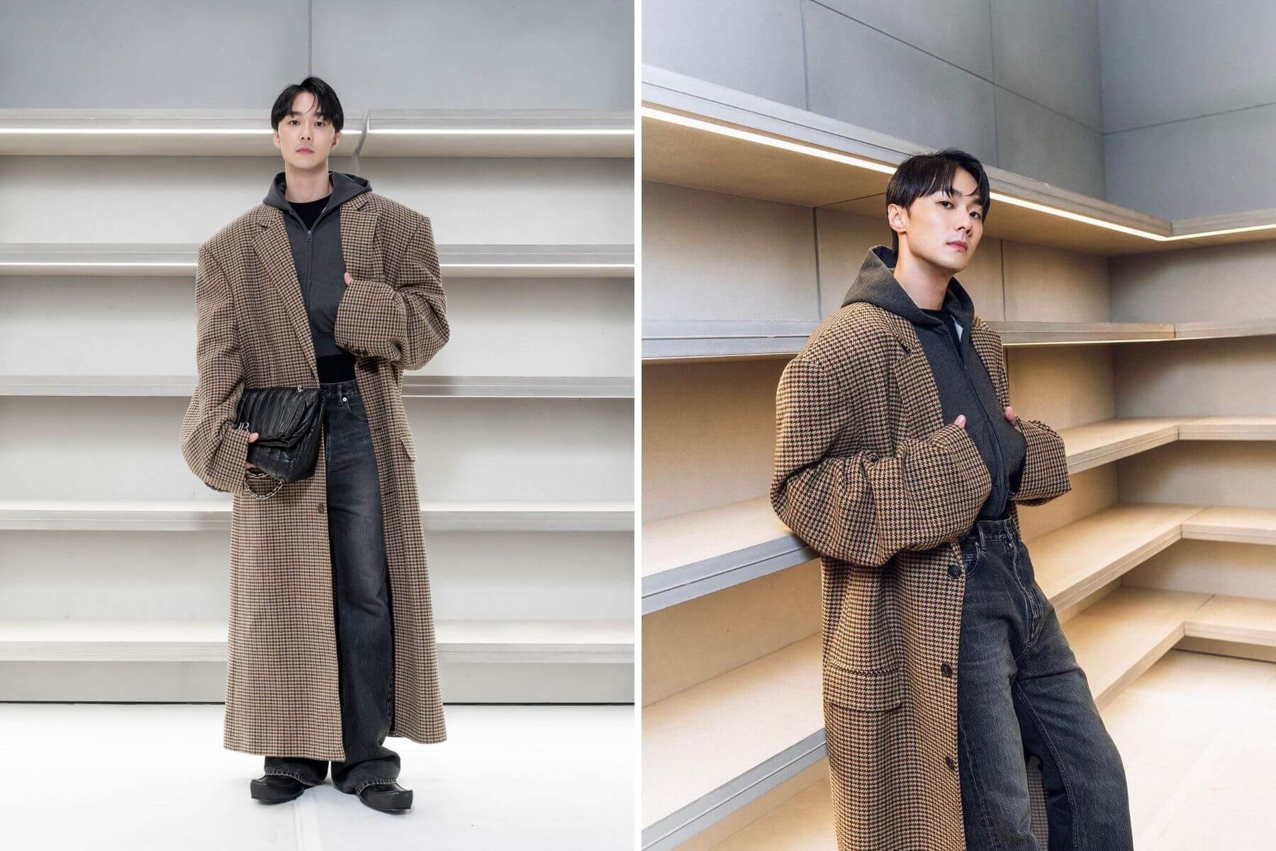 演員施柏宇出席Balenciaga台北101全新概念店開幕活動,模特兒出身的高挑身材撐起oversized落肩大衣輪廓。(左圖攝影/黃士庭;右圖/翻攝施柏宇官方Instagram@patrick8589)