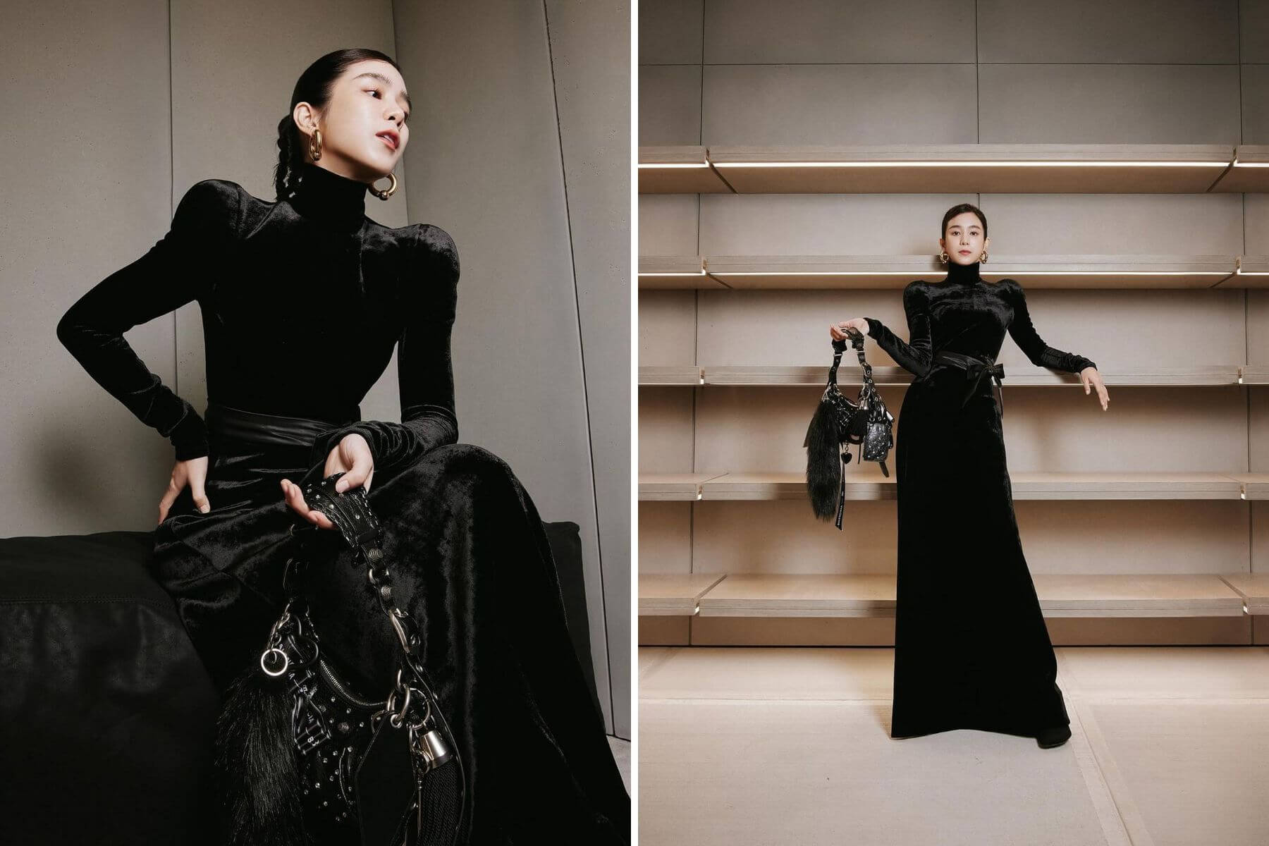 金鐘影后溫貞菱出席Balenciaga台北101全新概念店開幕活動,貼身洋裝展現身段,同時也體現品牌著稱的肩線巧思。(左圖/翻攝温貞菱官方Instagram@forestwen;右圖攝影/黃士庭)