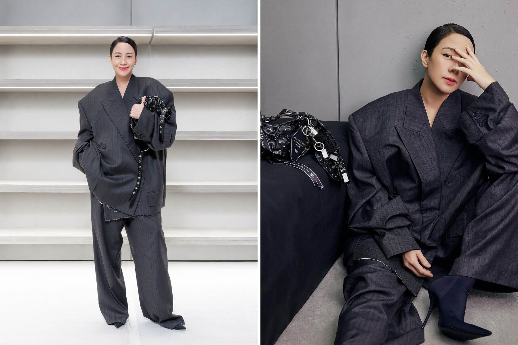 金馬影后林嘉欣出席Balenciaga台北101全新概念店開幕活動,身著oversized西裝、梳著服貼油頭,展現時髦的中性風尚氣場。(左圖攝影/黃士庭;右圖/翻攝林嘉欣官方Instagram@karenalamkayan)