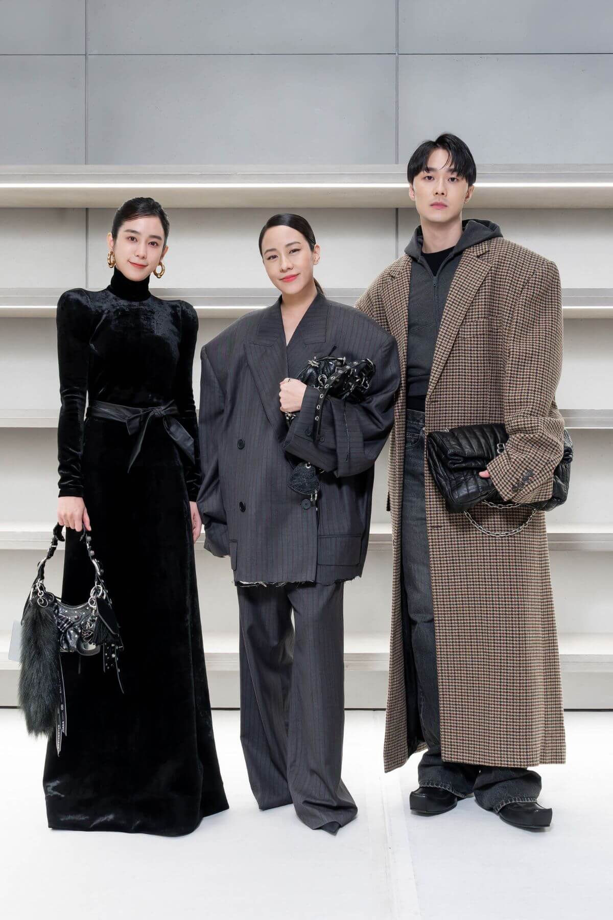 演員(由左至右)溫貞菱、林嘉欣、施柏宇三人一同出席Balenciaga 101專賣店開幕,並身著品牌最新早春/春季服飾。(攝影/黃士庭)
