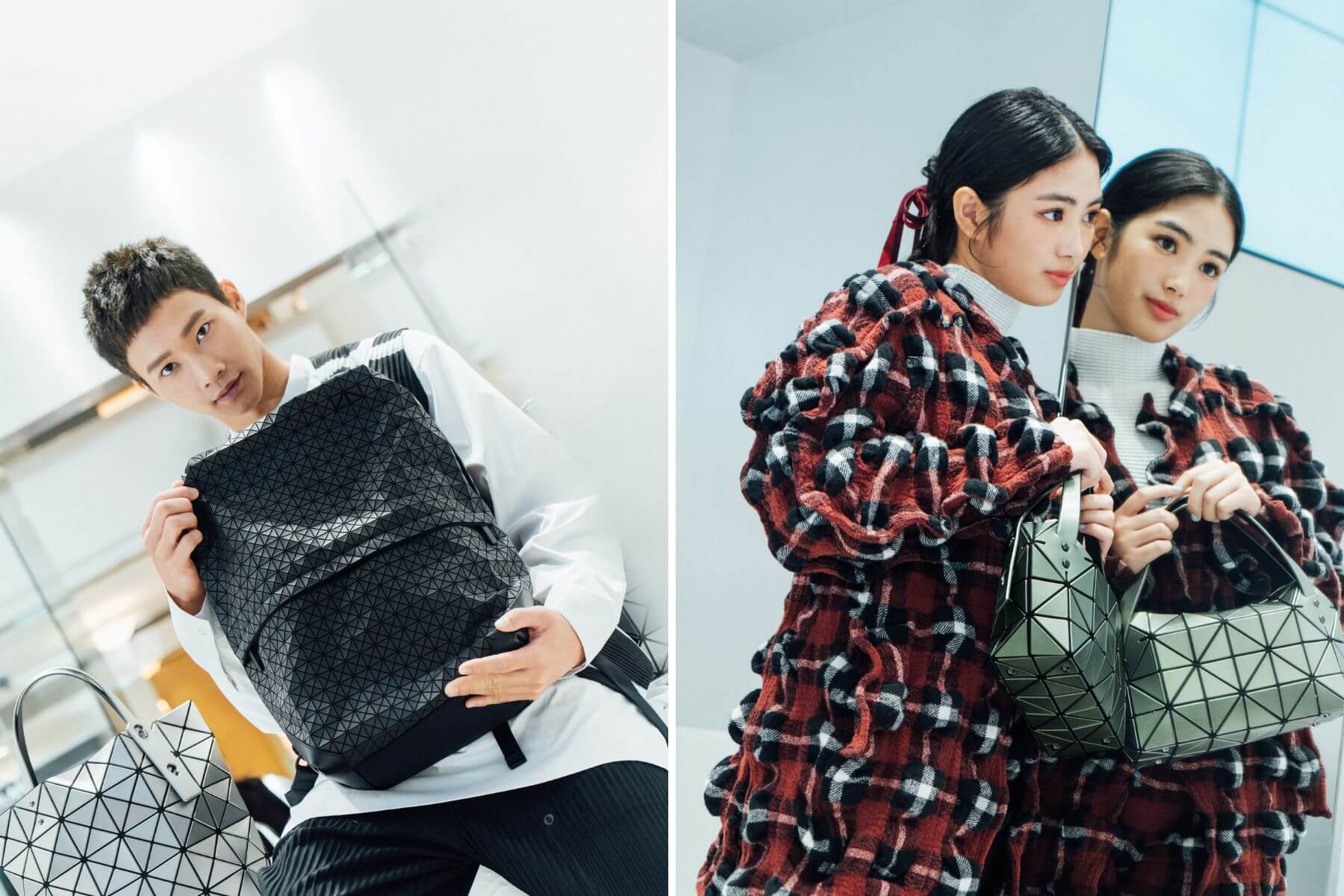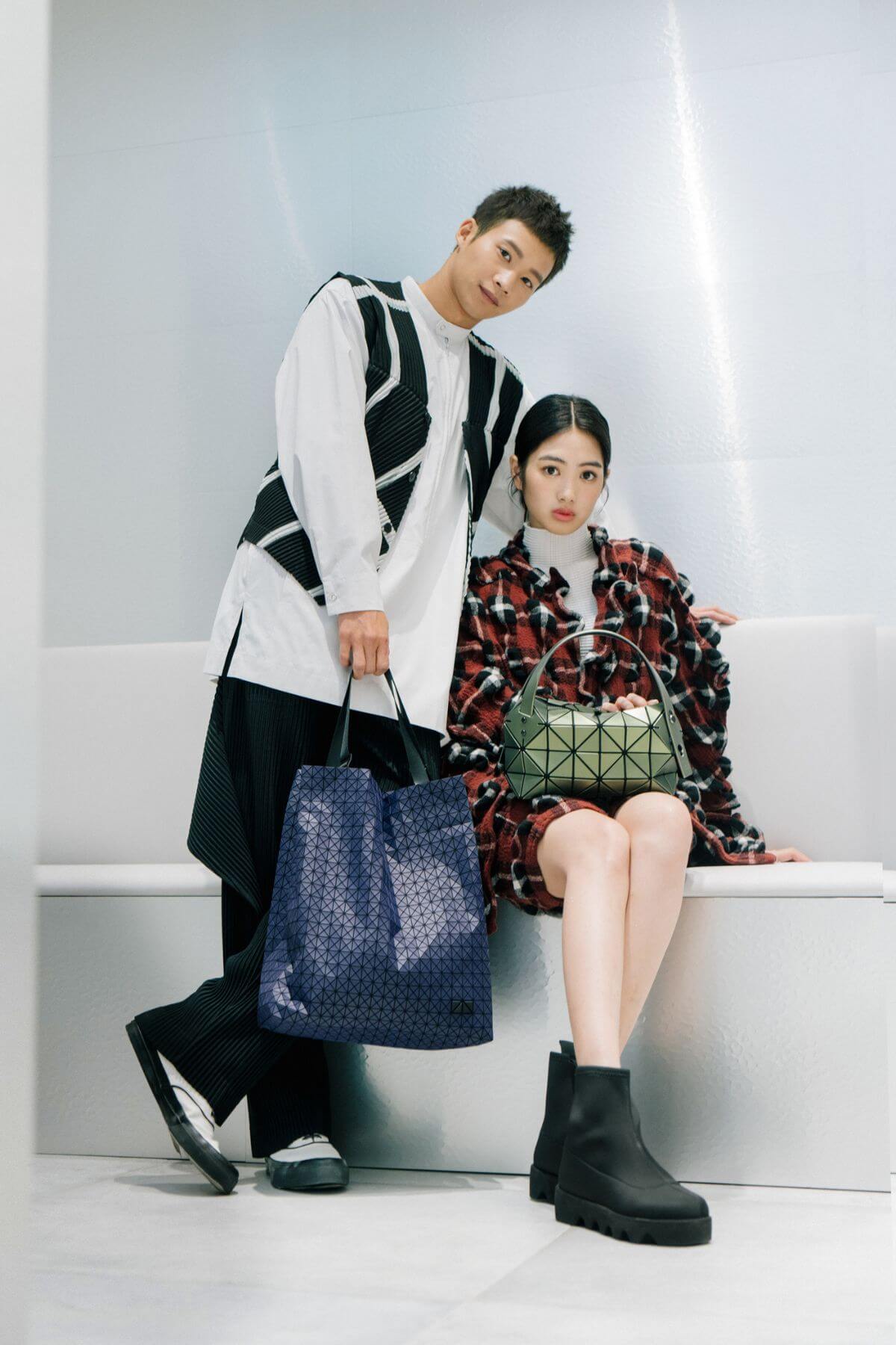 黃冠智(圖左)與雷嘉汭(圖右)身著ISSEY MIYAKE 旗下服飾示範 BAO BAO ISSEY MIYAKE 最新包款。
