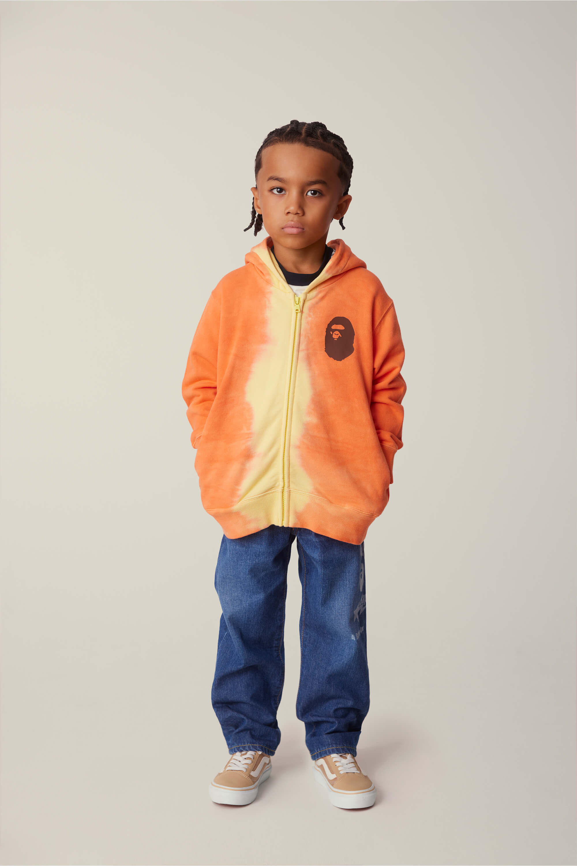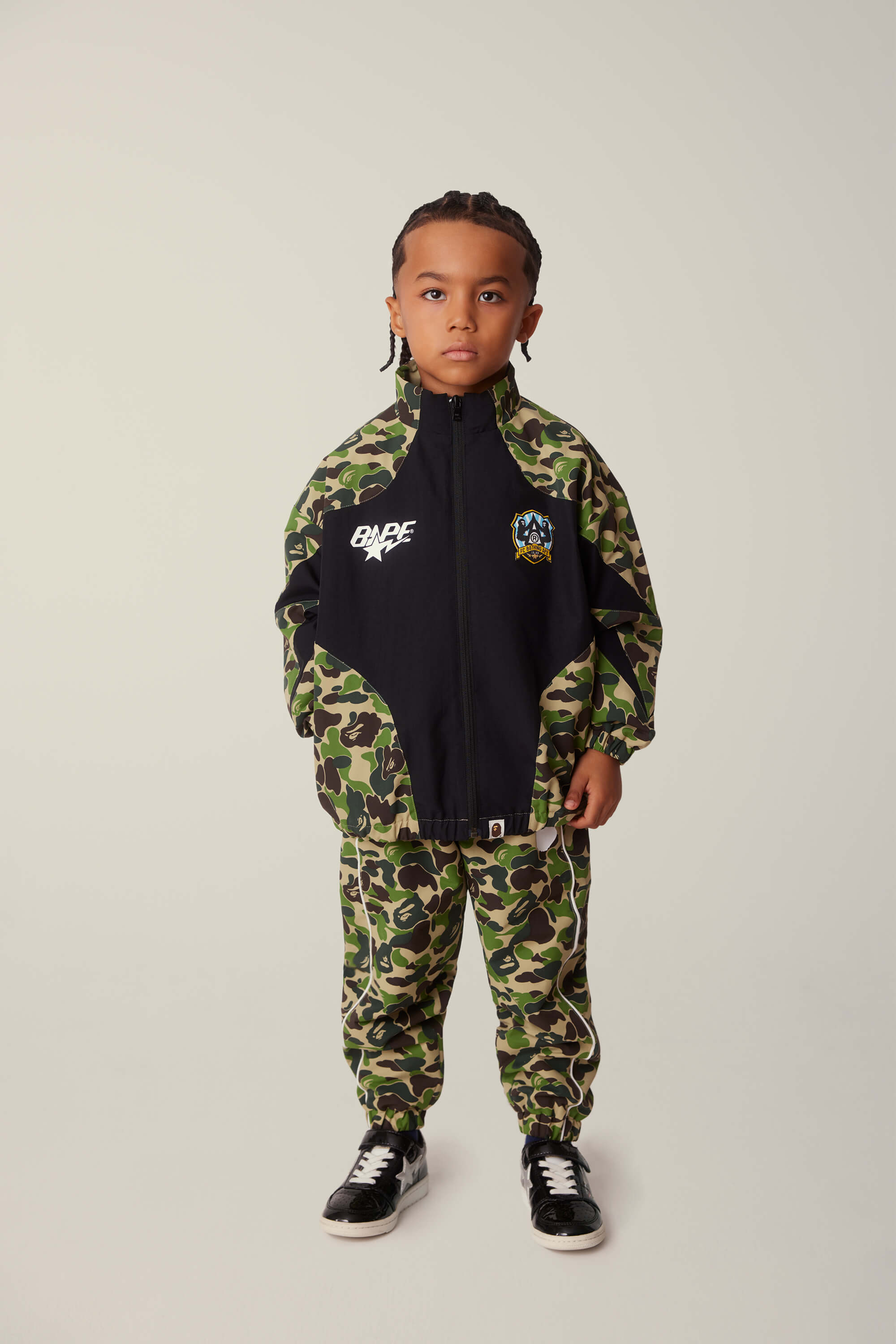 童裝系列則把 SS26 的迷彩與圖像邏輯轉成更柔軟、可動的版本。GLITCH WOODLAND CAMO 使用棉質針織與羊毛材質,適合全天穿著;SPLIT CAMO 則以 COLOR CAMO 與 1ST CAMO 對切拼接,延伸至鯊魚連帽衫等代表性款式。運動支線也以美式足球為靈感推出球衣與運動服,並搭配 BABY MILO® 圖案與 STA 元素,讓「黃金年代」的街頭想像變得更輕盈、更日常。