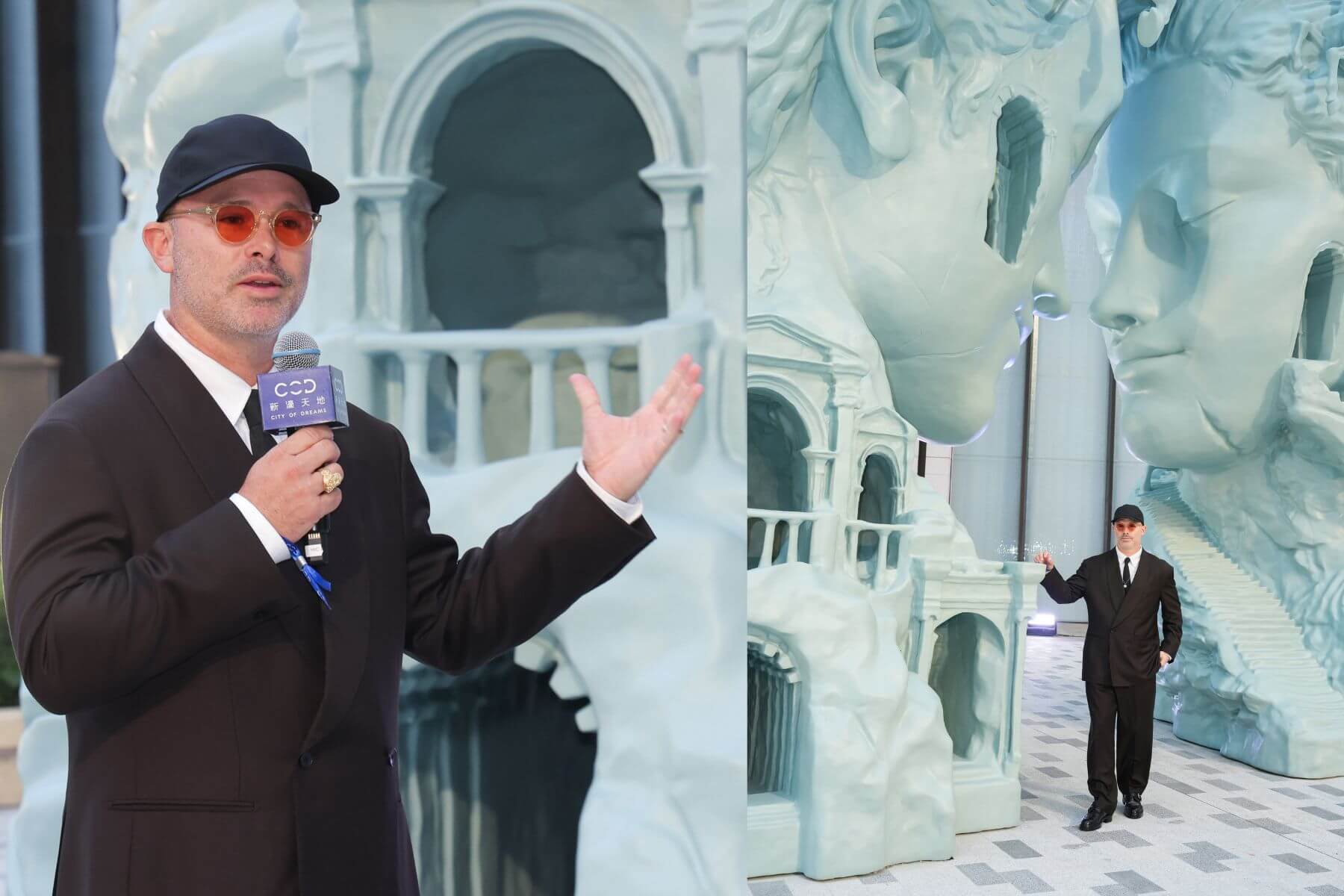 在正式步入室內大廳前,最先映入眼簾的是矗立於戶外、正對著馬路的巨型裝置,是由美國藝術家Daniel Arsham為新濠天地量身打造的《夢幻之門》。Arsham運用他最具代表性的「虛構考古學」手法,將原本平整、當代的門廊型態,處理成彷彿穿越千年時光、帶有崩裂與侵蝕感的文明遺跡。