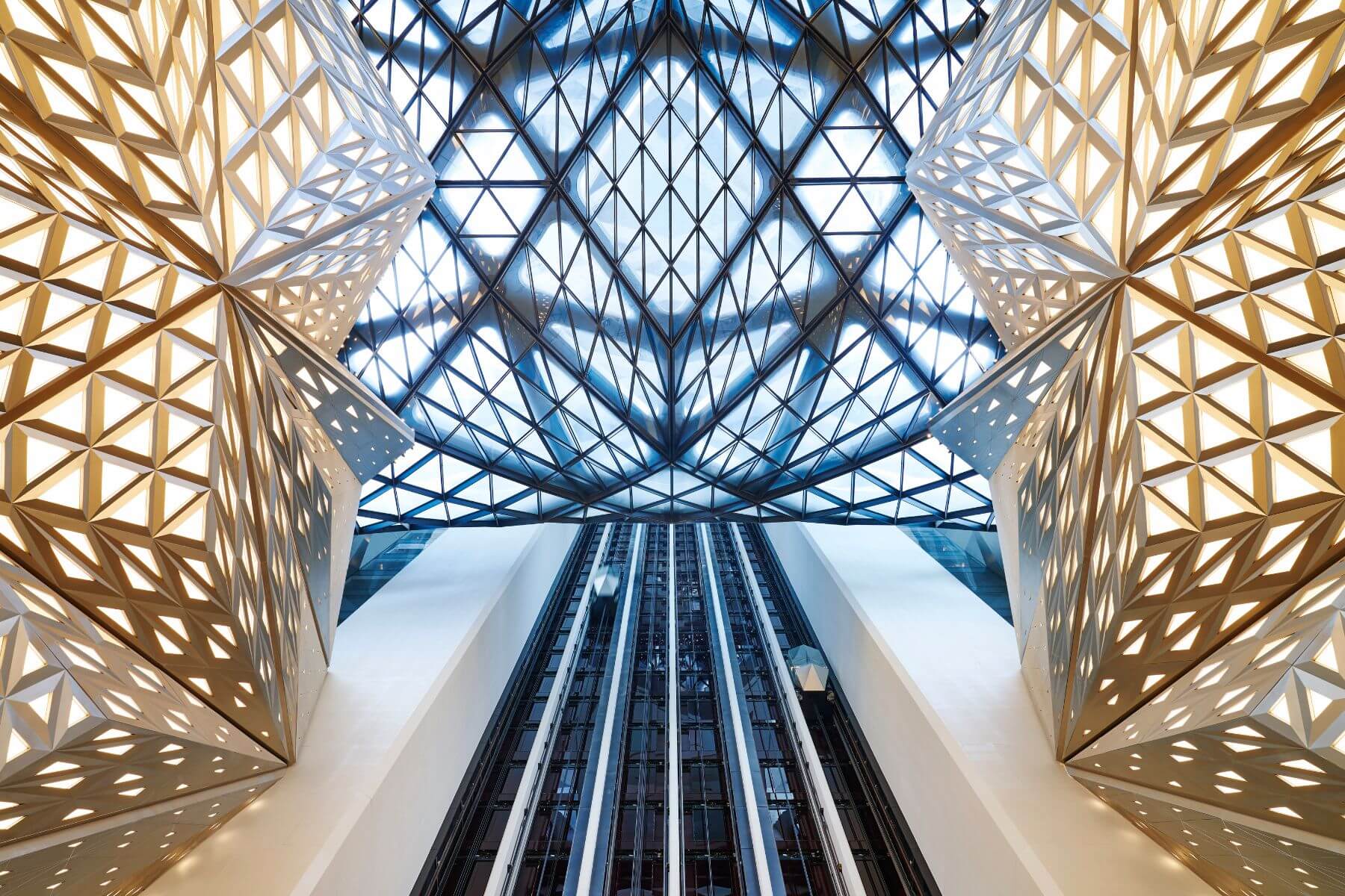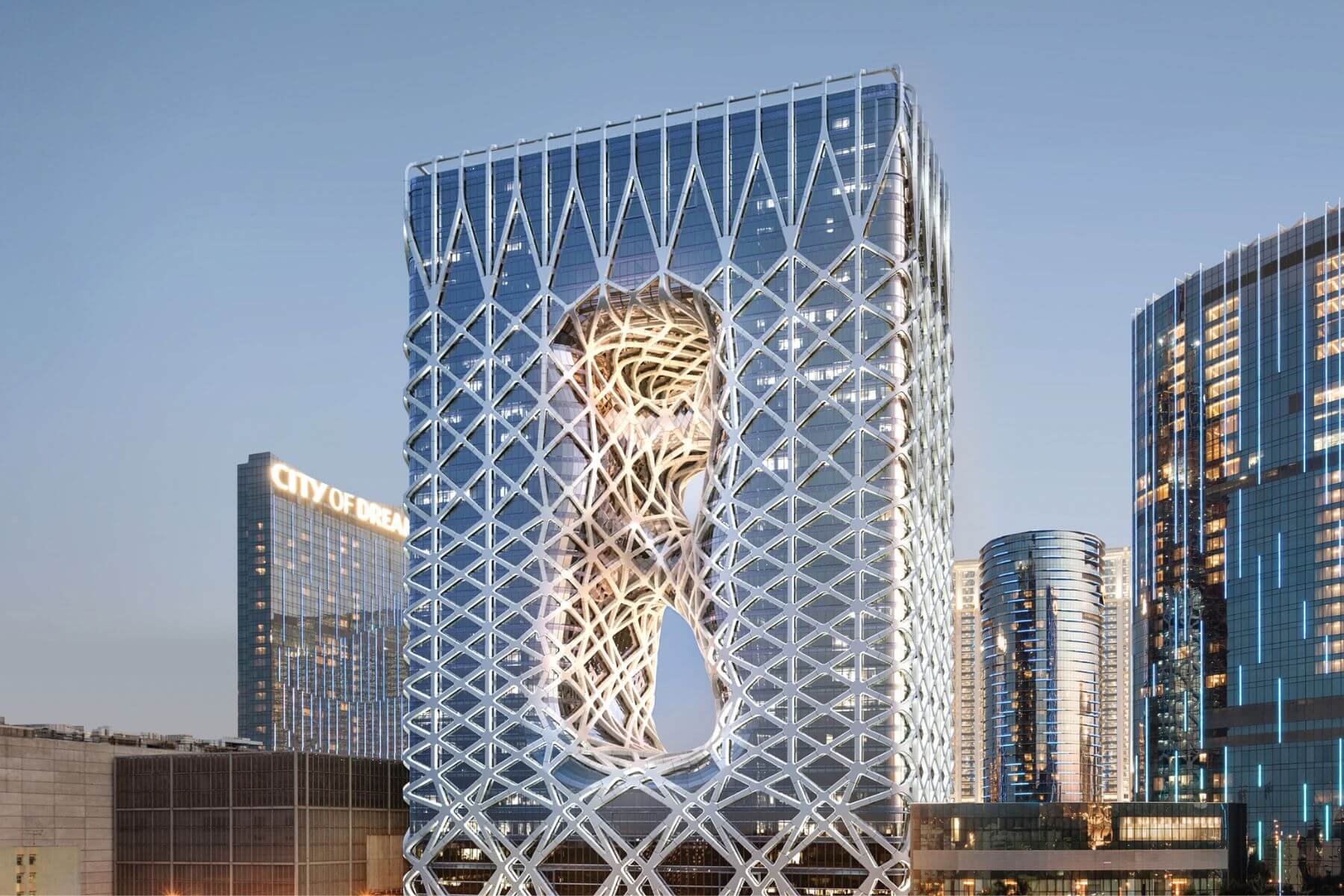 踏入室內,如果要選一棟建築能代表21世紀的澳門,絕非「摩珀斯」莫屬。這座由已故傳奇建築大師札哈·哈蒂(Zaha Hadid)親自操刀的遺作,徹底顛覆了我們對「大樓」的傳統認知。它捨棄了常見的內部粗大鋼柱支撐,取而代之的是利用全球首創的「自由形態外骨骼」結構。這層精密的編織網狀鋼鐵,像是一層充滿生命力的皮膚,緊緊包裹著兩座獨立的高塔,展現出極致的力度美學。