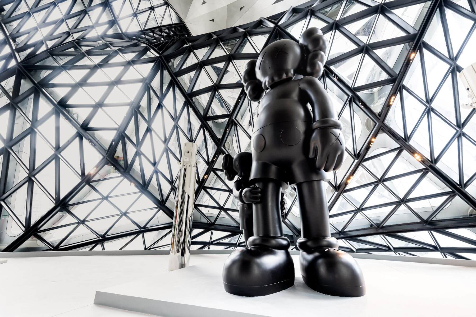 搭乘高速觀光電梯直達 23 樓的「藝賞二十三」,這是一個打破室內外邊界的半開放藝廊。在這裡,藝術不再是遙不可及的展品,而是與建築空間共呼吸的存在。其中最吸睛的莫過於當代藝術大師KAWS的巨型雕塑《Good Intentions》。這對父子造型的公仔以溫潤的深色木質紋理呈現,在充滿未來感、甚至帶點科幻冷冽的建築空間中,流動著一種衝突卻溫暖的人文氣息。