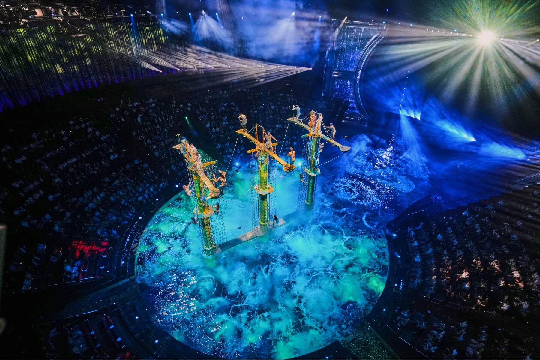 澎湃活力的視覺奇觀:朱利亞諾‧佩帕里尼以戲劇化的敘事手法,將高空雜技與澎湃的生命力完美融合。這不只是特技的堆疊,更是一場前衛的水效科技冒險。舞台地板能在不到一分鐘內,從水波蕩漾迅速升起,變成完全乾燥的陸地,支持著史詩般的敘事轉場。