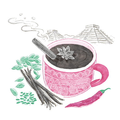 在馬雅文化時期,可可是極為神聖的飲品,將可可加入辣椒、玉米粉及香料沖製成熱飲,作為王室貴族補充精力的飲品。小豆蔻、肉桂、丁香、茴香籽、辣椒及香莢蘭都很適合與巧克力做搭配,可以選擇已磨成細粉的香料粉,依自己的喜好比例調配,與黑巧克力塊一起加入熱牛奶攪拌均勻。入口辛香帶點微辣,身子很快就暖了起來。