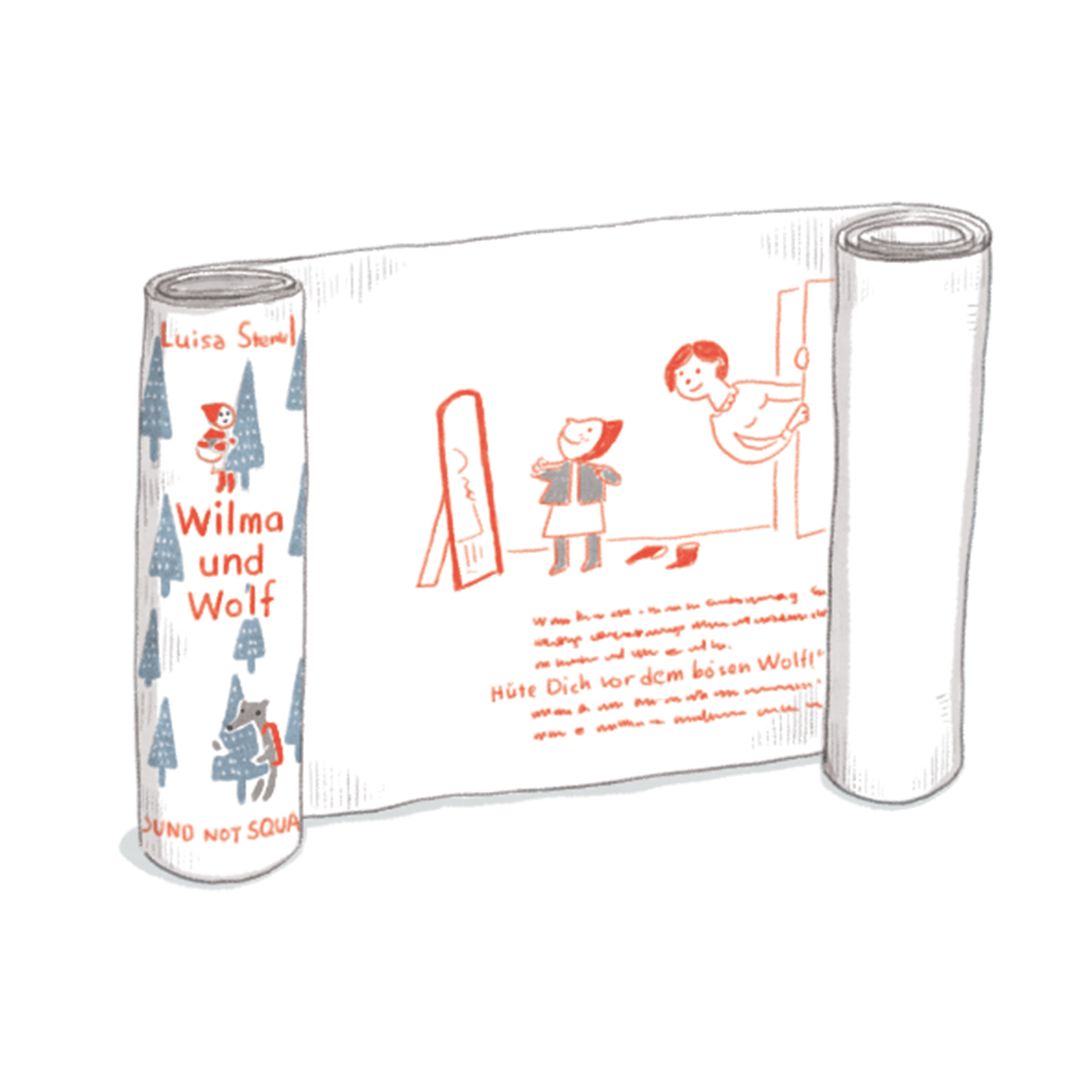 古式閱讀姿態與顛覆 改編自小紅帽,在這本長11公尺的德國卷軸版本,Wilma戴上紅色尖帽子,出門去找奶奶,在森林途中,貪吃樹莓時與背包客Wolf相遇,因為一個搞笑的誤會,接連引發背包客Wolf一連串的倒霉事件!顛覆既定角色個性,將既定抽離刻板印象。