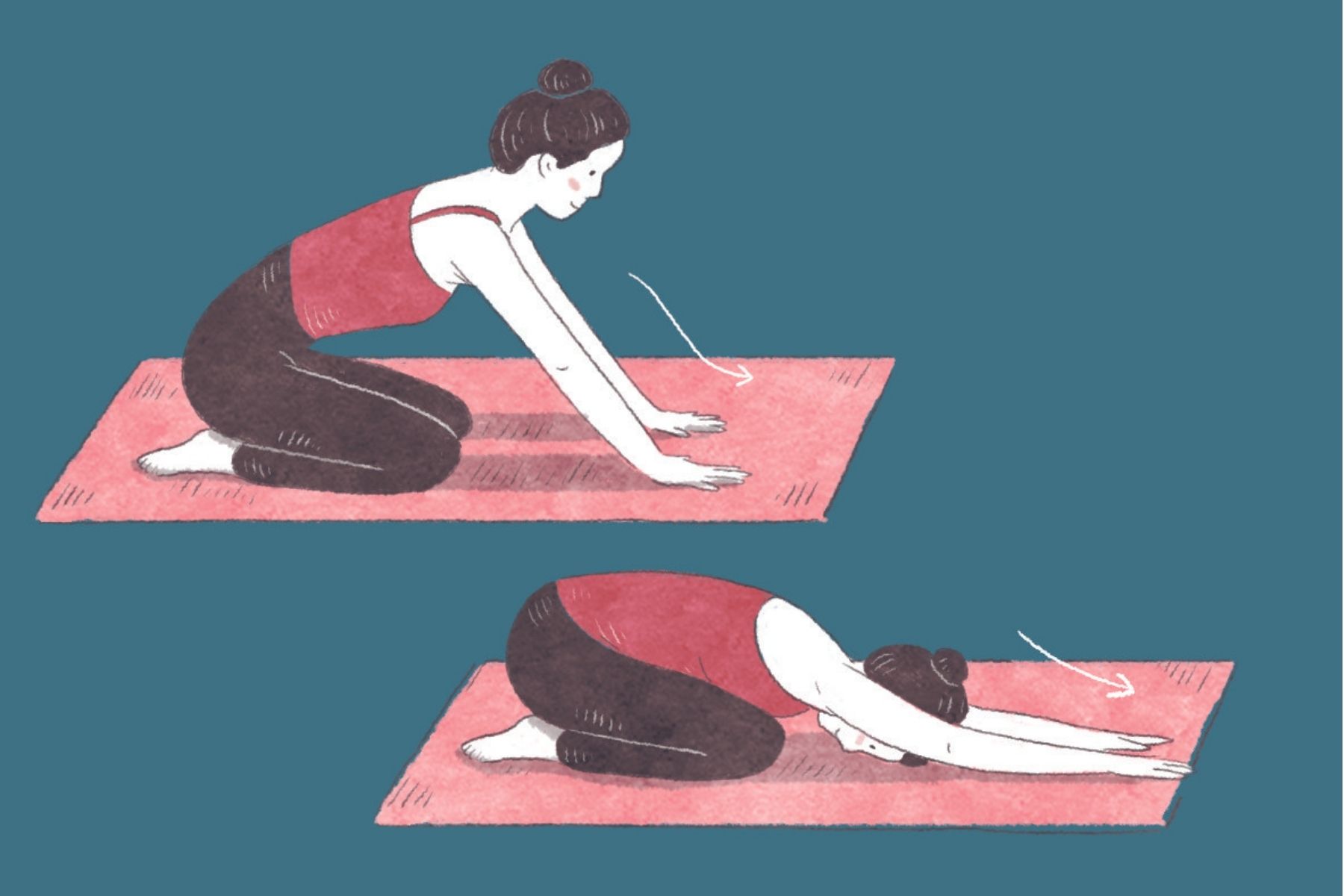 ❶ 嬰兒式 休息一下。嬰兒式是一個寧靜的姿勢,可以在更具挑戰的體位法之間好好放鬆、調整氣息。從四足跪姿開始,感覺脊椎中立、手腳穩定扎根於地面,將雙腳大拇指靠近,吐氣時將屁股往腳跟坐,膝蓋打開與墊子同寬,把抱枕置放於雙腿之間,深吸氣將上半身延伸,吐氣時往前趴在抱枕上,持續感覺深吸氣到後背,吐氣時將整個身體的重量交給地板。停留二分鐘後吸氣慢慢帶回到四足跪姿。 ![]() |