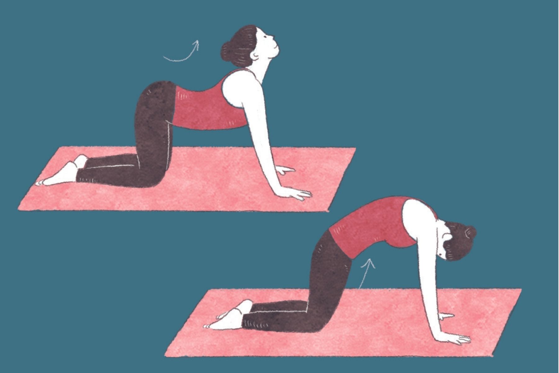 ❷ 貓牛式 從四足跪姿開始,兩腿膝蓋與臀部同寬,確定膝蓋放在臀部下方,手腕、手肘和肩膀在同一條線上並與地面垂直。將頭部置於中立位置,眼睛望著地板。在進入牛式時擴大肩胛骨並將肩膀向下拉,遠離耳朵來保護頸部。通常吸氣時進入牛式,吐氣時進入貓式,通過呼吸節奏去感受身體的溫和流動,也能嘗試改變吸吐與動作的搭配,獲得截然不同的練習狀態。五至八次貓牛式後慢慢帶回到四足跪姿。 ![]() |