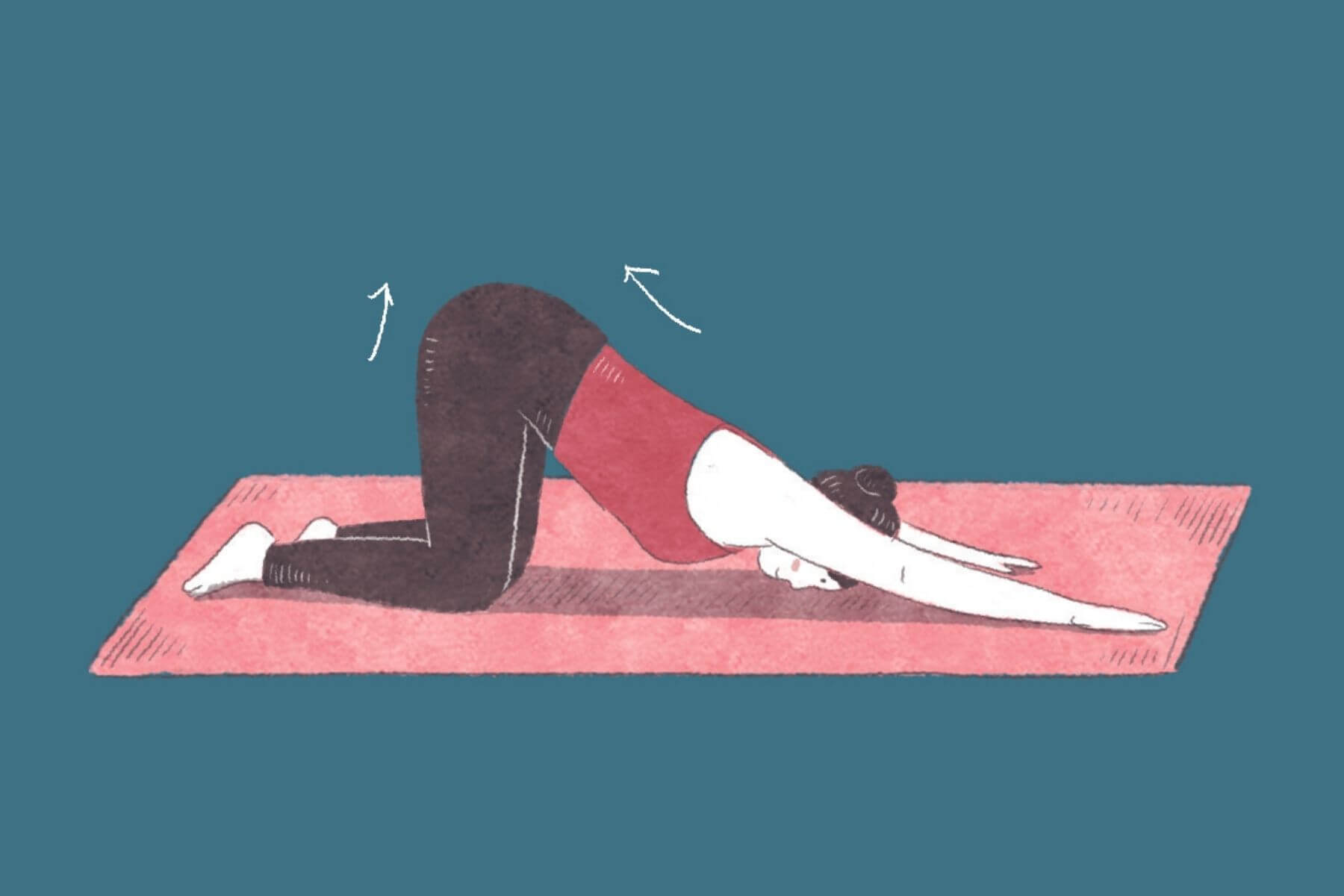 ❸ 小狗式 介於嬰兒式與下犬式之間的小狗式,在腋下、肩膀與上背部都提供了超乎想像的伸展,充滿挑戰!從四足跪姿開始,將臀部保持在膝蓋上方穩定整個下半身的力量,接著雙手慢慢往前爬,讓額頭輕輕點在地板上,如肩膀過度緊繃,可以將雙手距離略微拉寬於肩膀,或用瑜伽磚或抱枕墊高頭部,減輕頸部壓力。如果需要進一步拉伸頸部和喉嚨,可以將下巴放在地面上,同時獲得更多開胸的練習。停留二分鐘後吸氣慢慢坐起身。 ![]() |