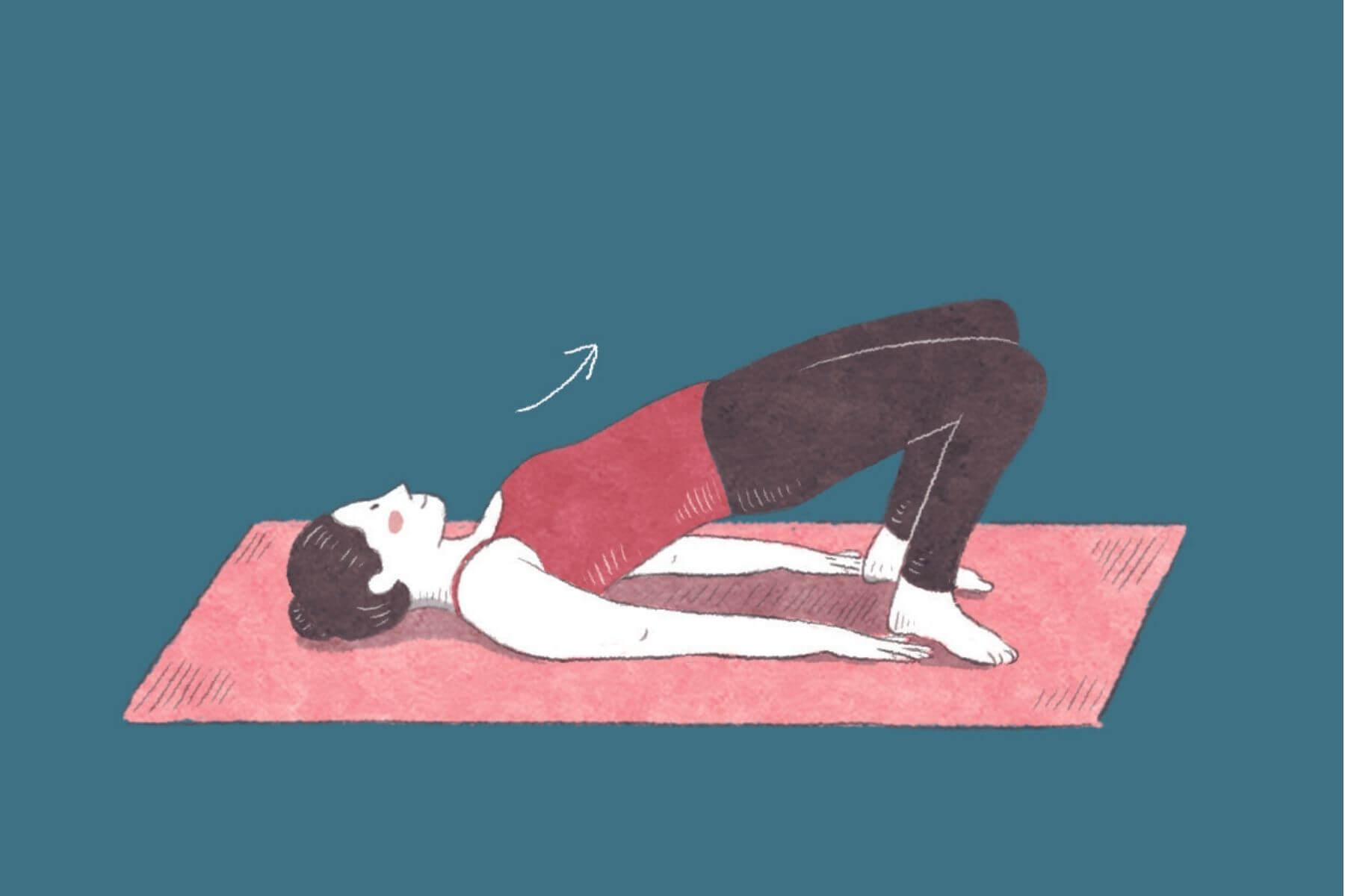 ❹ 橋式 橋式在扎根與上升的過程使心靈平靜、身體變得充滿活力!仰臥在地板上,彎曲膝蓋,將雙腳平行放在地板,雙腳距離約與臀同寬,腳跟與屁股的距離約手臂伸直時可以輕碰到的位置。將腳刀內外側踩穩,手臂施力往地板推,吸氣將臀部提起離開地板。大腿保持平行,膝蓋保持在腳跟上方,膝蓋不向內或外傾倒。骨盆下方的雙手十指互扣握拳,並伸長手臂,保持肩膀的頂部向中線靠近。將下巴從胸骨稍微抬起,感覺後腦勺輕輕往地板靠。在橋式保持五至八個呼吸,吐氣時將脊柱緩慢向下滾動到地板上。 ![]() |