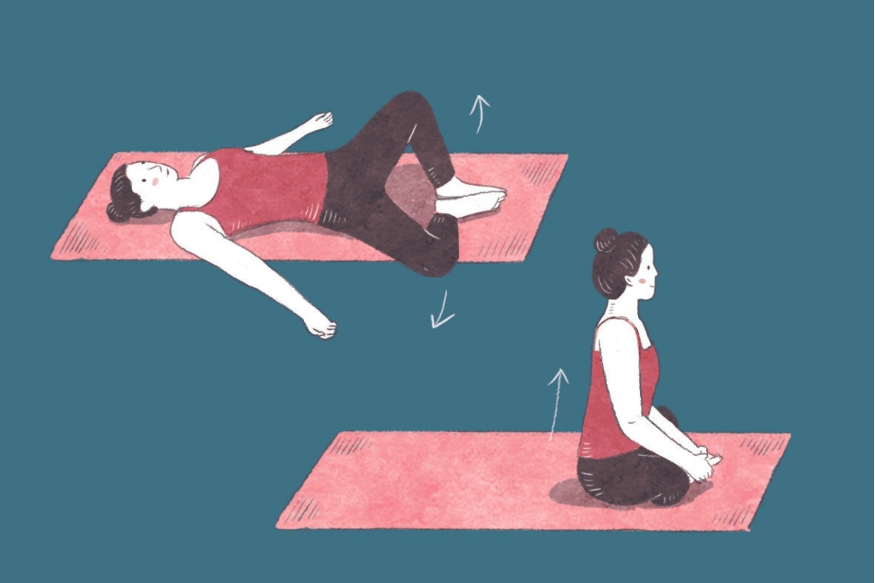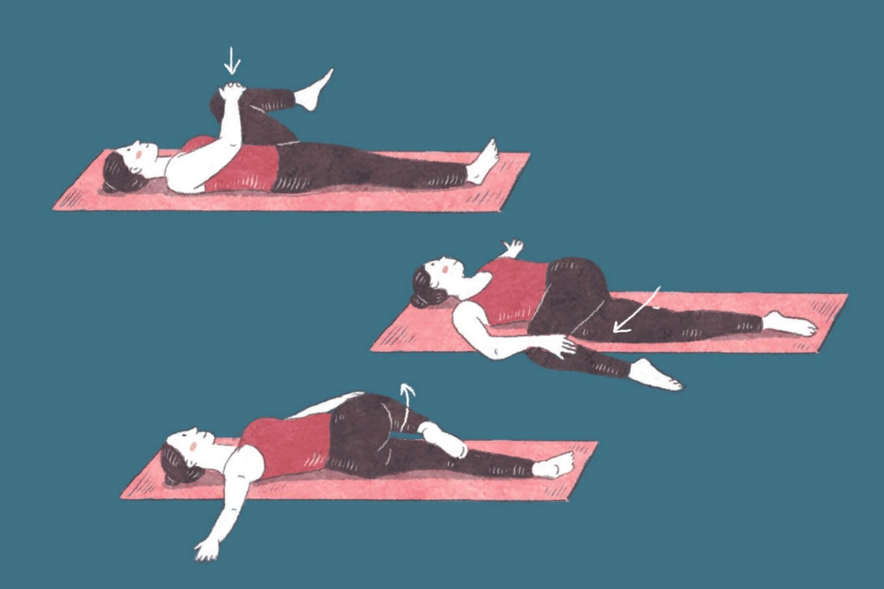 ❺ 單腿排氣式+排氣式扭轉 多數人因為工作久坐不動,失去了完整的脊柱旋轉。首先是右腿排氣式一分鐘,彎曲右膝,將雙手環抱住右膝,伸直左腿,吐氣時讓將右大腿盡可能靠近腹部,同時保持下背部往地板貼,停留幾個呼吸,每次吸氣都感覺胸口充飽氣,腰背有自然的弧度,吐氣時腹部內收,下背與地板幾乎不留縫隙。 接著進入排氣式扭轉一分鐘,將彎曲的右腳順著吐氣慢慢放往左邊,將右手打開,盡可能把右肩膀貼緊地板,頭轉向右,如果覺得肩頸部壓力過大,可以將頭擺正。完成右腿一組再換左腿一組,結束時雙腿併攏、雙膝彎曲抱向自己胸口,試試看將自己滾坐起來,若發現難度太高也可從側邊推起身。 ![]() |