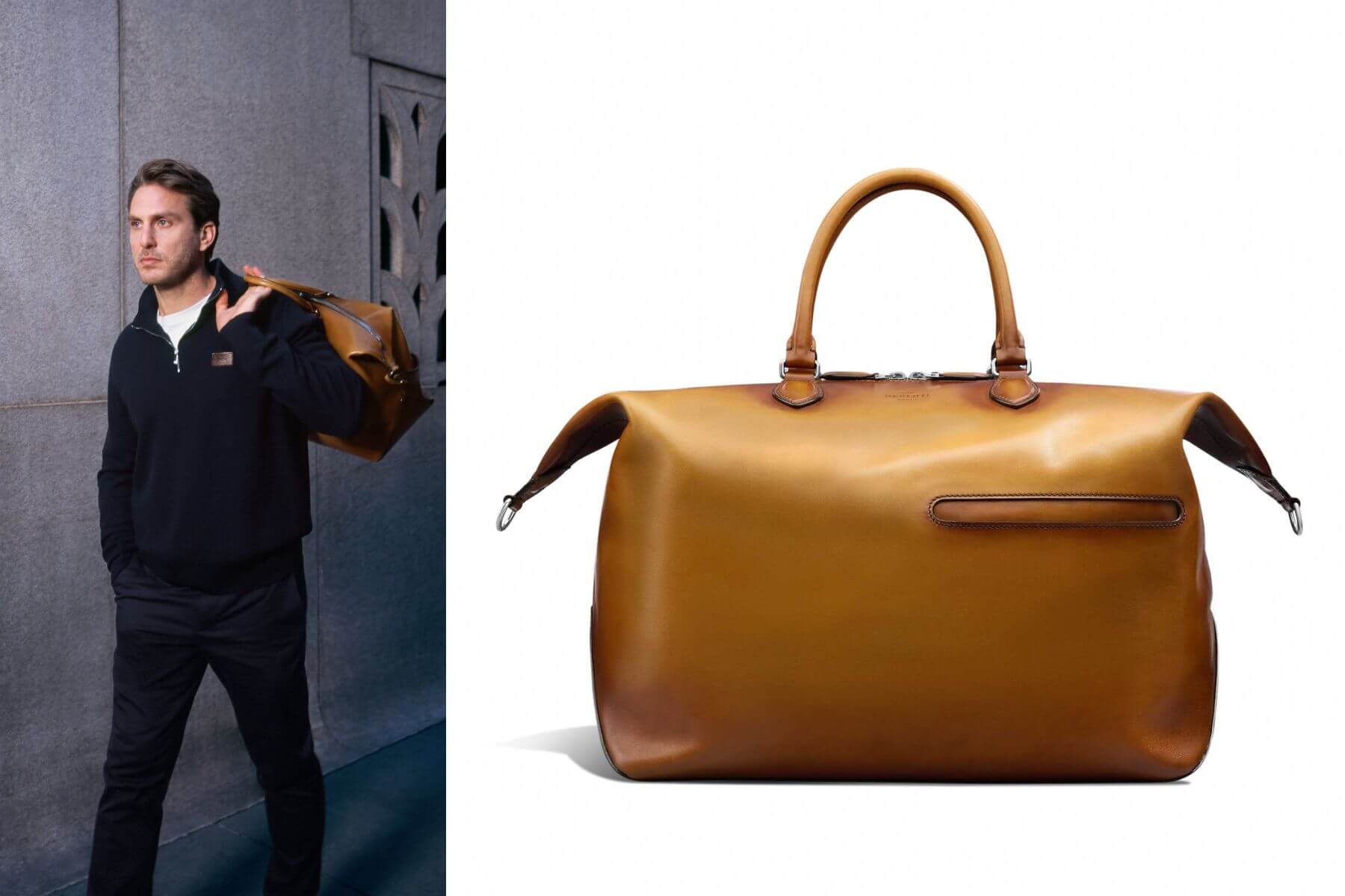 例如第一篇章中的Toujours包款,該詞在法文中有「一整天/all day」之意,形象片中的Toujours包款,能裝載都會紳士一整天必需品的超大容量,主角著用的Patina古法染色鐵鏽棕色皮外套,將工坊引以為傲的染製工藝完美展現;草綠色麂皮飛行外套與沙色科技面料car coat,則完美展現Berluti模糊不同質地面料和皮革界線的工藝。