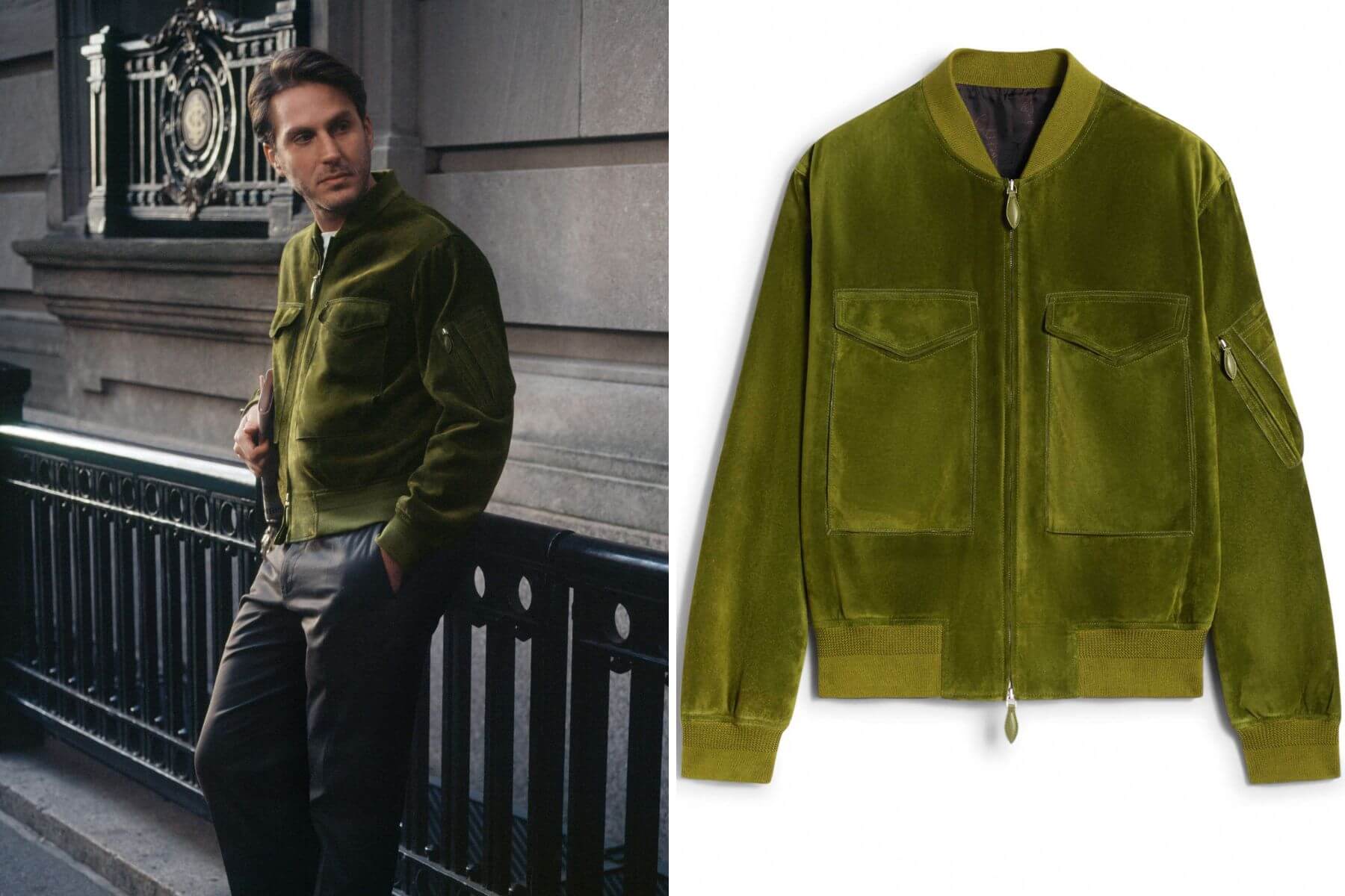 (圖右)草綠色麂皮飛行外套_$275,000 by Berluti。