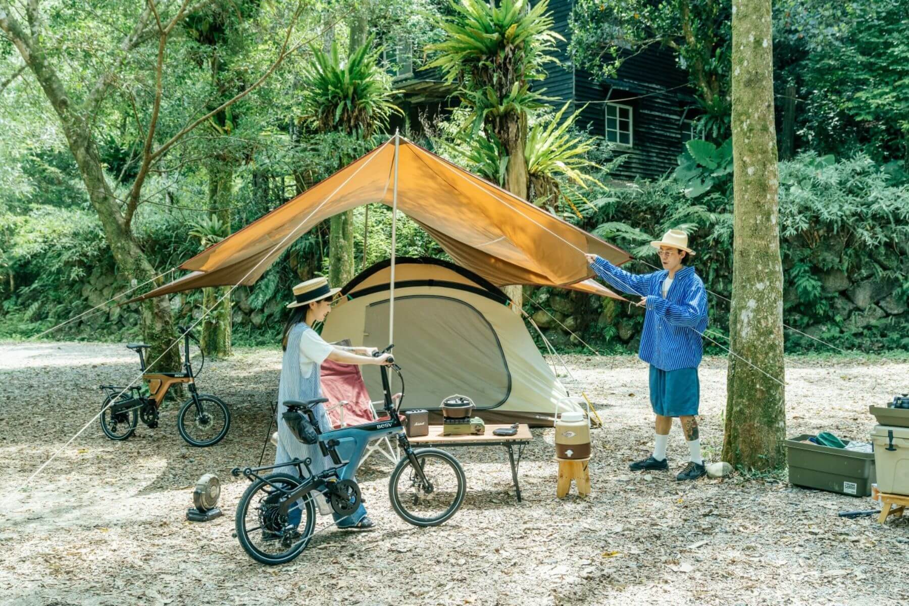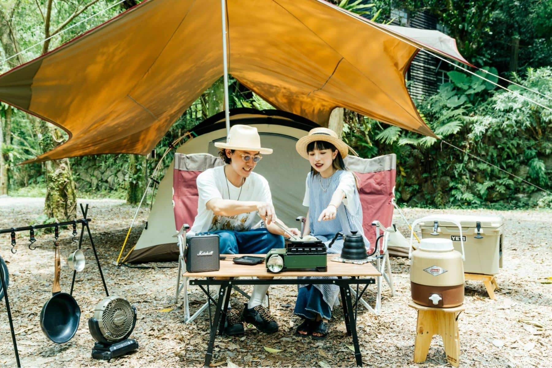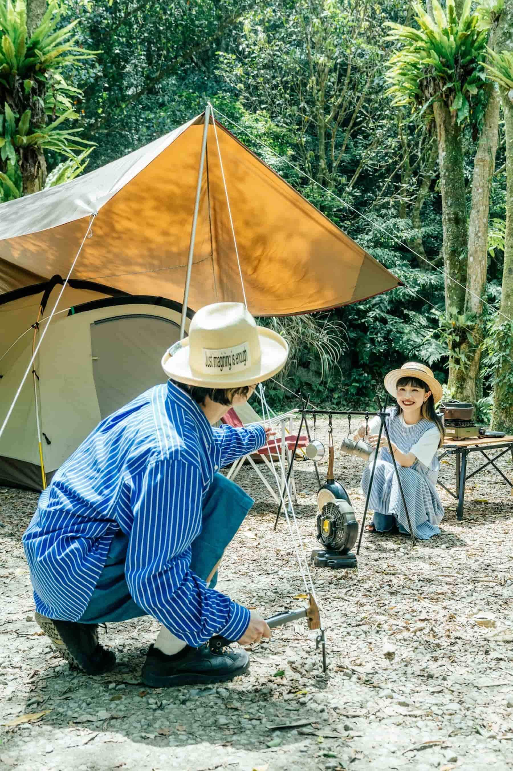 選定營地後,開始搭帳、立起天幕,Halu 和 Kiki 憑藉著對日本流行文化的熱愛,從服裝出發,對於日常使用的東西保有一定的品味堅持,從鍋爐、桌椅、帳篷,到單車、隨身音響,甚至是播放的音樂,彷彿日雜《POPEYE》的 City boy & girl 重現在真實生活。