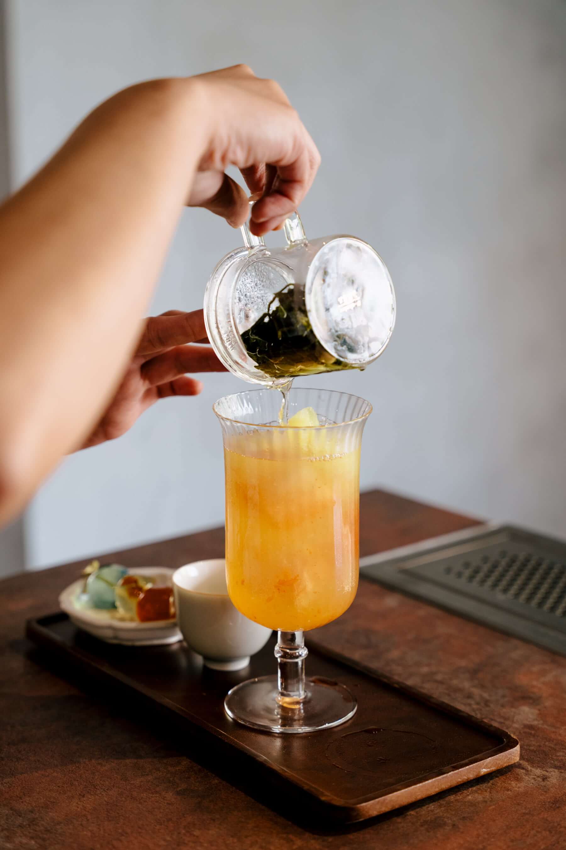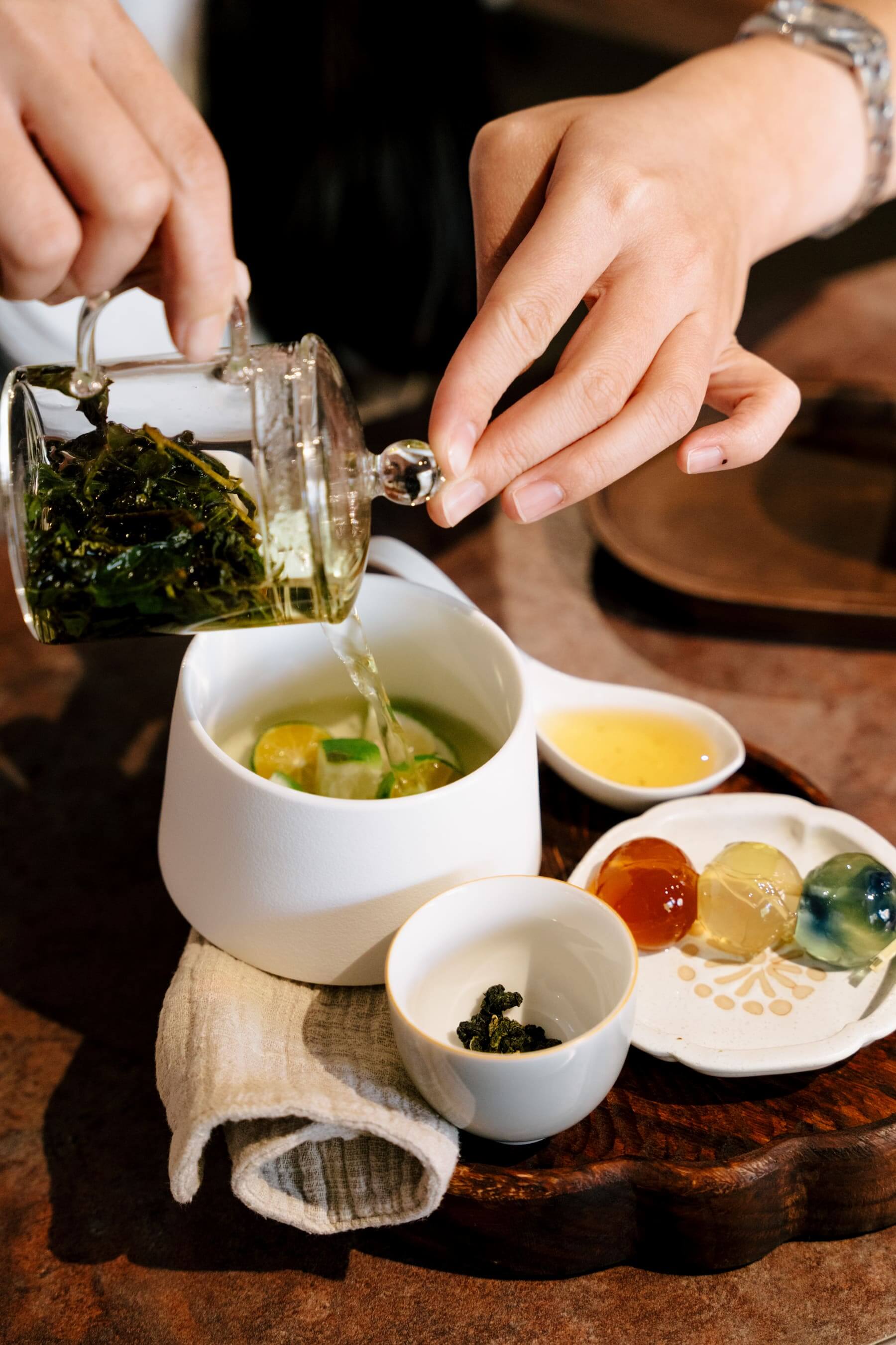 food by blank 推出期間限定追光套餐「冬收」,「柚柚冰香」將金萱烏龍作為基底,搭配熬煮的金萱糖漿與盛產於秋冬的紅肉葡萄柚(圖左);熱飲「金柑和茶」以金萱烏龍作基底,搭配盛產於冬季的台灣金柑(圖右)。