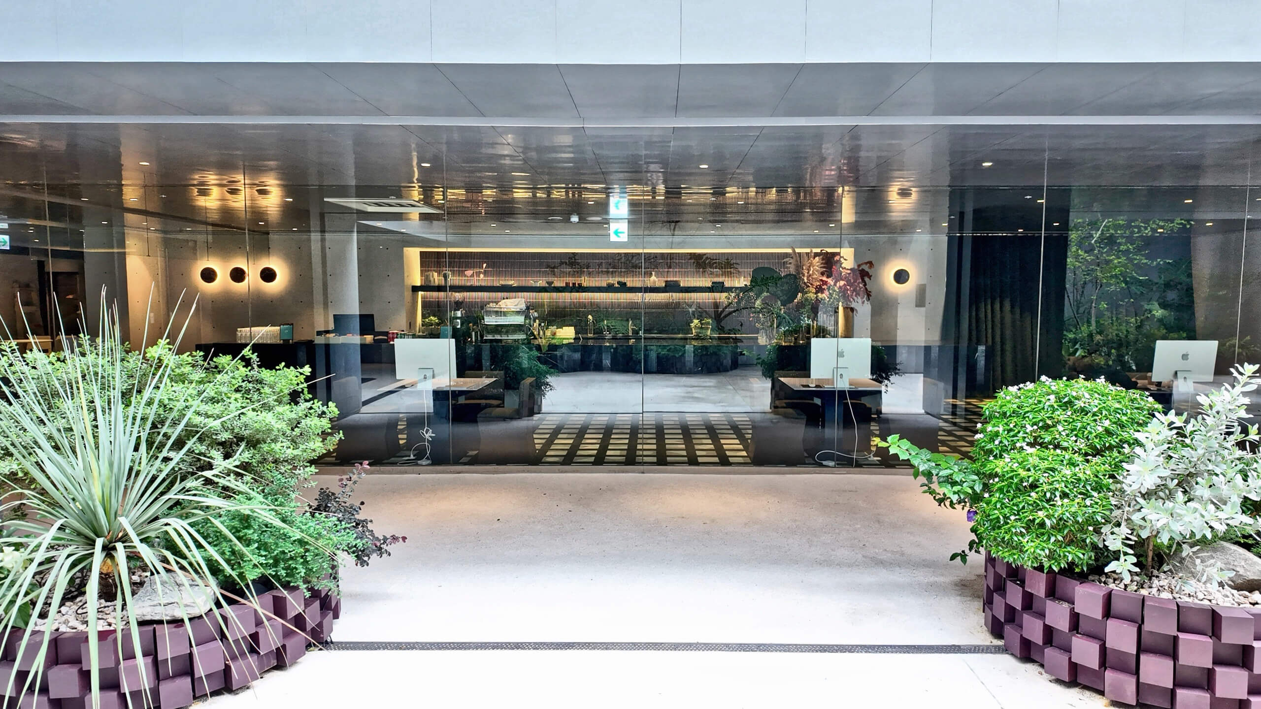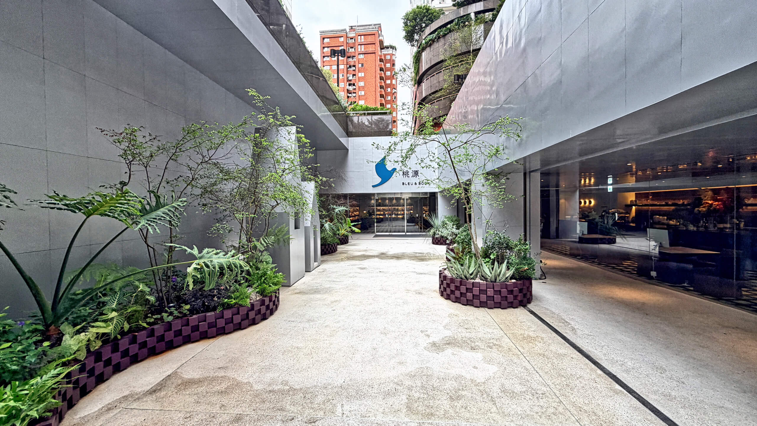 座落於虎頭山腳、南崁溪畔,介於山林與城市之間,桃源Bleu & Book名稱呼應「桃園」的地名,也取自《桃花源記》的精神意象。前往書店需自地面拾級而下,穿越由頂級花藝品牌CNFlower設計、以「閱讀一座花園」為題的銀色廣場。偌大的廣場上包含從全日照植栽到雨林植物,象徵從現實步入幽境的過渡轉換。
