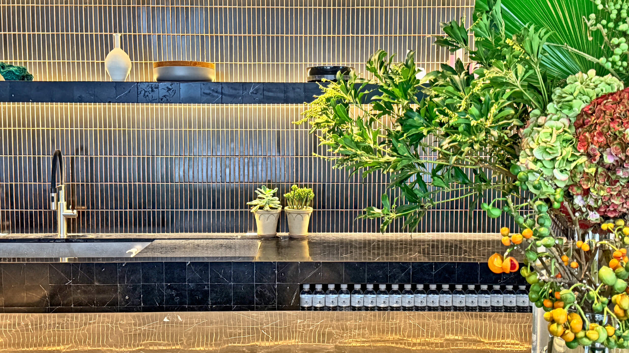 桃源Bleu & Book的空間動線依「進入層次」設計,由外而內分成三個節奏分明的段落。第一個段落是入口的銀色森林廣場,由金屬、植物、石材交織出的光影與靜謐,象徵從現實步入幽境,進到一座閱讀花園。第二部分是深色大理石構成的咖啡吧檯,這裡以城市書房的廚房為概念,提供義式咖啡、簡餐、甜點與調酒。