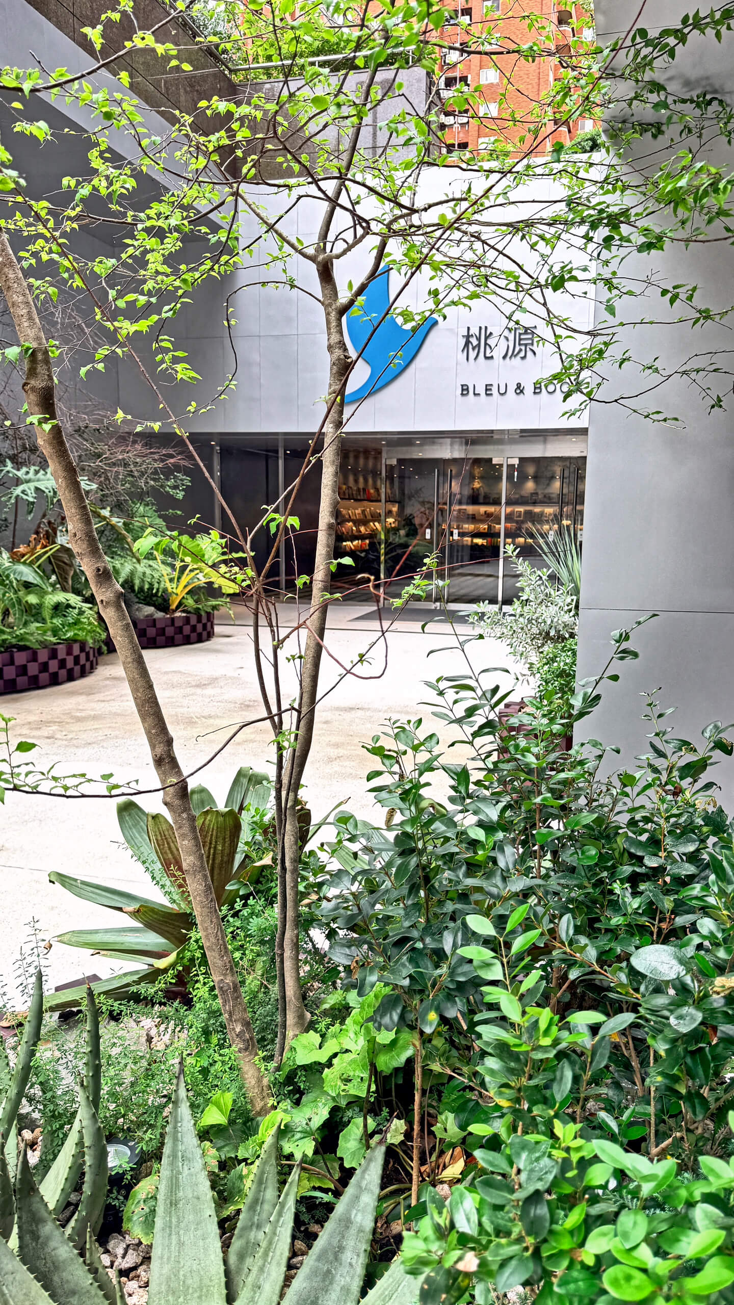 桃源 Bleu & Book 的入口,並非直接面對街道,而是藏於一座銀色植物花園之後。由頂尖花藝品牌 CNFlower 精心設計,以「閱讀一座花園」為主題,由層次豐富的植物景觀,從陽光植栽到雨林植株,可以從不同角度探索花園的雪白色小屋,結合自然光,構成如呼吸般的銀色韻律。石材鋪地,引導安靜、沉穩的步伐,步行數公尺,即如陶淵明筆下:「初極狹,才通人。」那一刻,你彷彿穿越了城市的邊界,進入一個自成一格的閱讀幽境。