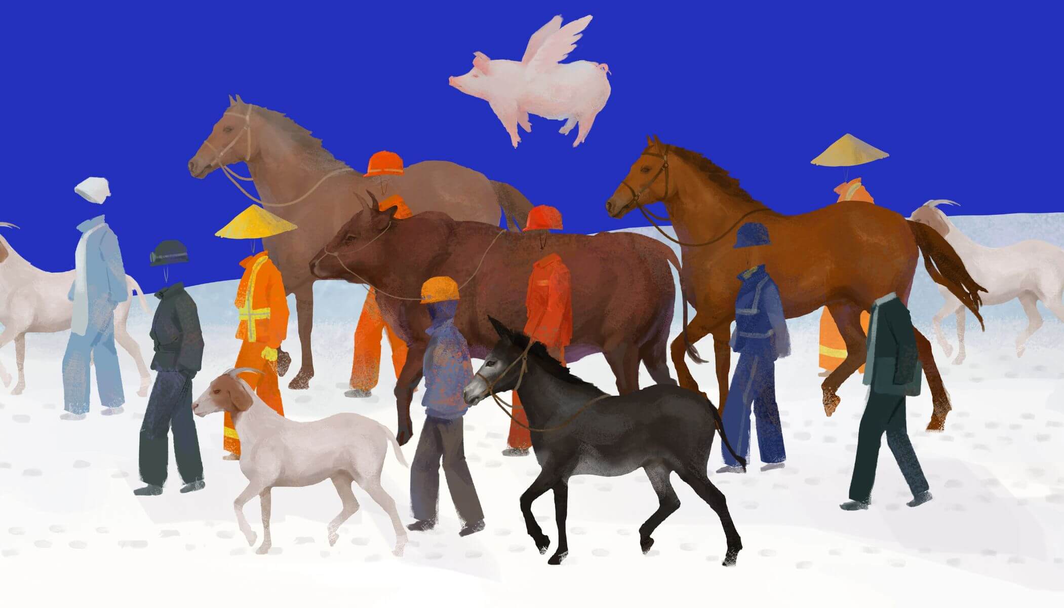 皮村的工人們面臨著邊緣化與孤立的現實。楊寒的《正在消失的火車站》以詩意的鏡頭記錄了傳統交通的消逝,在城市化的浪潮中,那些被忽視的勞動者與逐漸消散的村莊猶如時光中的幽影。作品透過對比現代都市的繁華與舊時光的褪色,喚醒對被遺忘的生活面貌與人群的溫柔關懷。《社畜》通過簡單的視覺語言,朱夢然生動地反映了中國工人階級的生活困境,強調了他們在城市邊緣地帶的沉默與無奈。李婧怡的《歡迎光臨》、《椅子》和《牡蠣桶》三件作品探討工人階級在社會結構中的邊緣化處境,揭示他們在全球資本主義體系中的孤立感與困境。這些作品集中展現了他們在現代都市中的孤立感和被邊緣化的經歷,同時也表現了他們內心深處的抗爭與情感力量。
