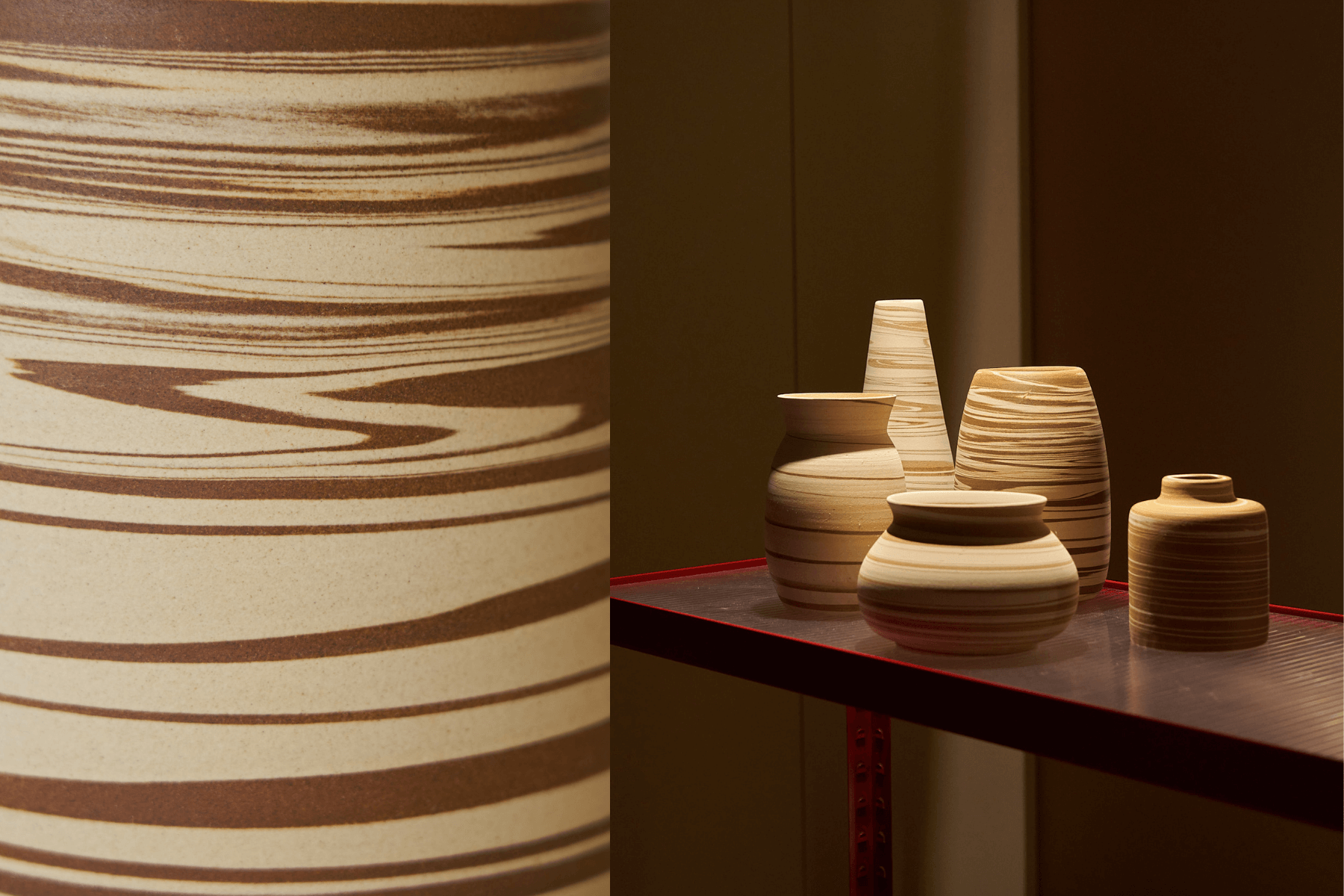 除了《Bodies》系列,展覽另一創作脈絡以「絞胎混土」技法展開。不同來源的陶土被揉合、擠壓、嵌進彼此之中。這些過程並非旨在製造視覺效果,而是讓材料本身的差異被保留下來。