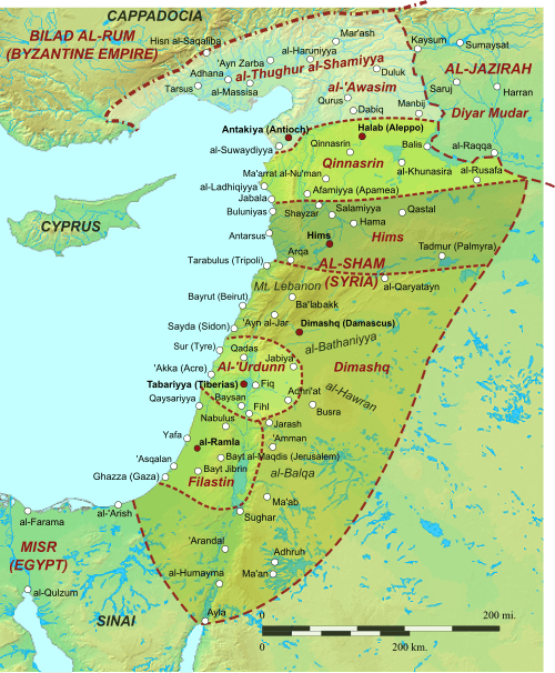 巴勒斯坦是敘利亞最西邊的幾個省分。從拉法(Rafah)到拉瓊(Al Lajjun)邊界是這片土地最長的距離,騎馬得花上兩天才能走完;雅法(Yafa)到耶利哥(Jericho)是其寬度,騎馬也得花上相同的時間。巴勒斯坦包含祖加爾(Zugar, Zoar, Segor)與羅得之人的國家、賈巴爾(Al Jibal;以東〔Edom〕的山區)與阿什撒拉(Ash Sharah)──這是兩個不同但相鄰的省分,乃至於更遠到艾拉(Ailah),都屬於巴勒斯坦的治理範圍。巴勒斯坦受到雨水與露水的浸潤,樹木與耕地不需要人工灌溉,只有在納布盧斯(Nablus),你才會見到流水灌溉。巴勒斯坦是敘利亞最肥沃的省分,其省會及其最大的城鎮是阿爾拉姆拉(Ar Ramlah),聖城(耶路撒冷)的規模也相去不遠。巴勒斯坦這個省的範圍也不算太大,但卻有約二十個清真寺,也設有週五禮拜的講壇。