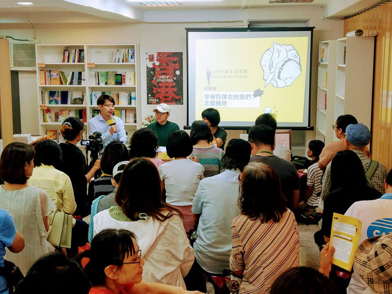2019年十月台北詩歌節時,六張犁季風帶書店舉辦詩講座《穿著防彈衣的我們怎麼擁抱》,由林韋地主持新加坡/馬來西亞郭詩玲、台灣林蔚昀兩位詩人的對談。(季⾵帶提供)