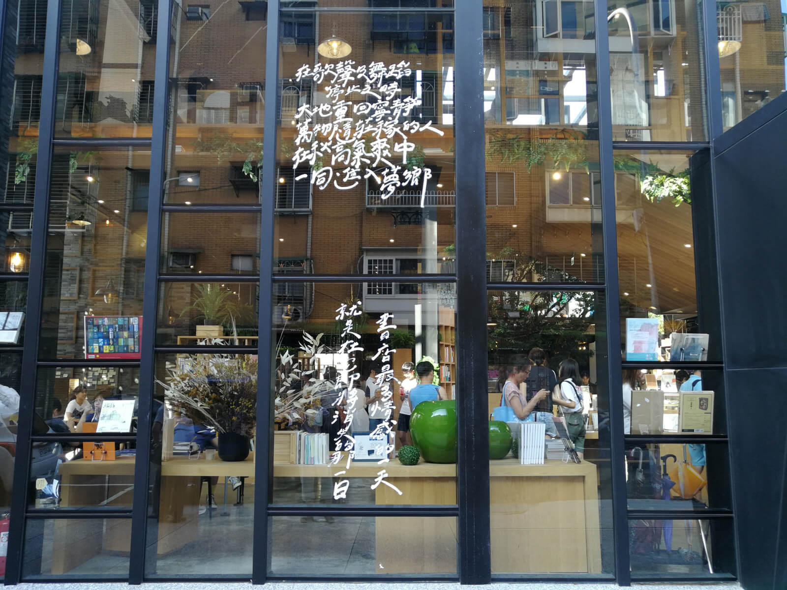 和平青鳥書店以「人文的態度」為主軸,店中央有棵兩層樓高的綠樹,更與台灣手寫字藝術家合作,在各個角落留下手寫標語,打造一個親於自然的人文空間。(莊家源提供)