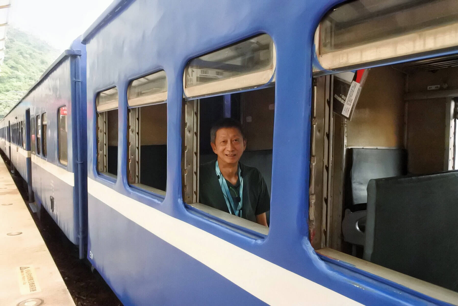 南國漫讀節活動重返全台最古老的行使列車——藍皮列車,並邀請多位講者跟著觀眾一起「閱讀山海」,圖為知名作家舒國治。(青鳥提供)