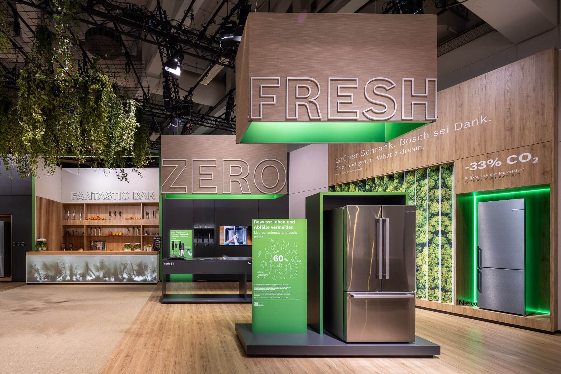 製造端也積極使用回收材料,目標在2030年前實現產品以50%回收材料製成,今年IFA展發表的BOSCH全新 ECO冰箱產品就使用了27%的可回收材料加上環保素材製作,如減少碳足跡的綠色鋼材、作為保冷夾層的塑料和泡沫材料都以可分解的再生生物基質材料(bio-based products)取代。從最初的產品設計發想、投入製程都有具體的實踐。