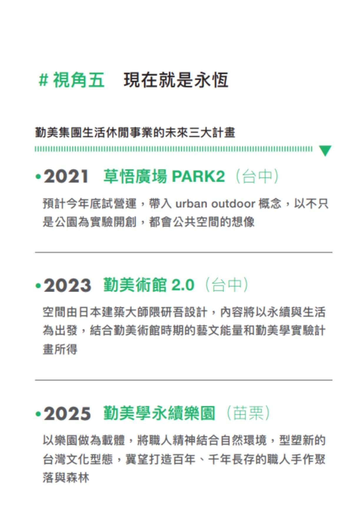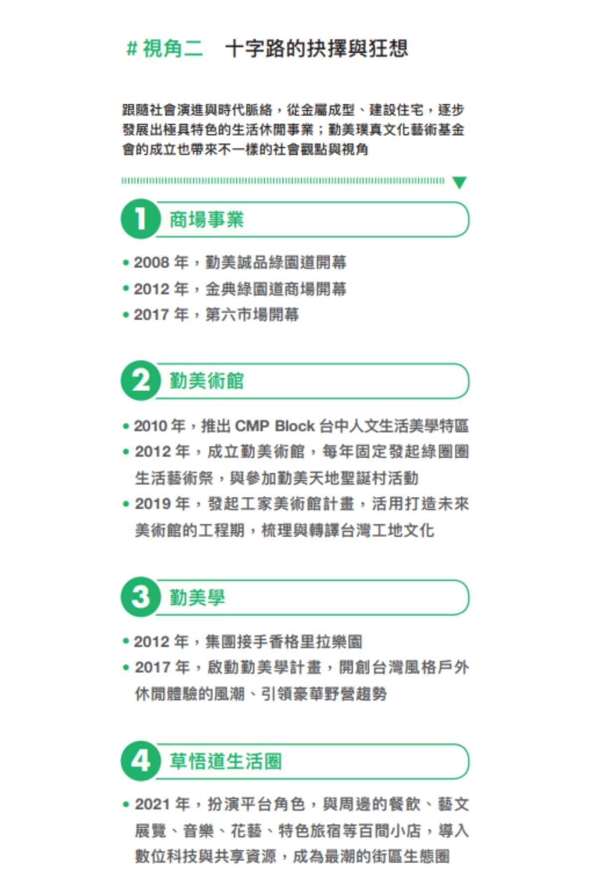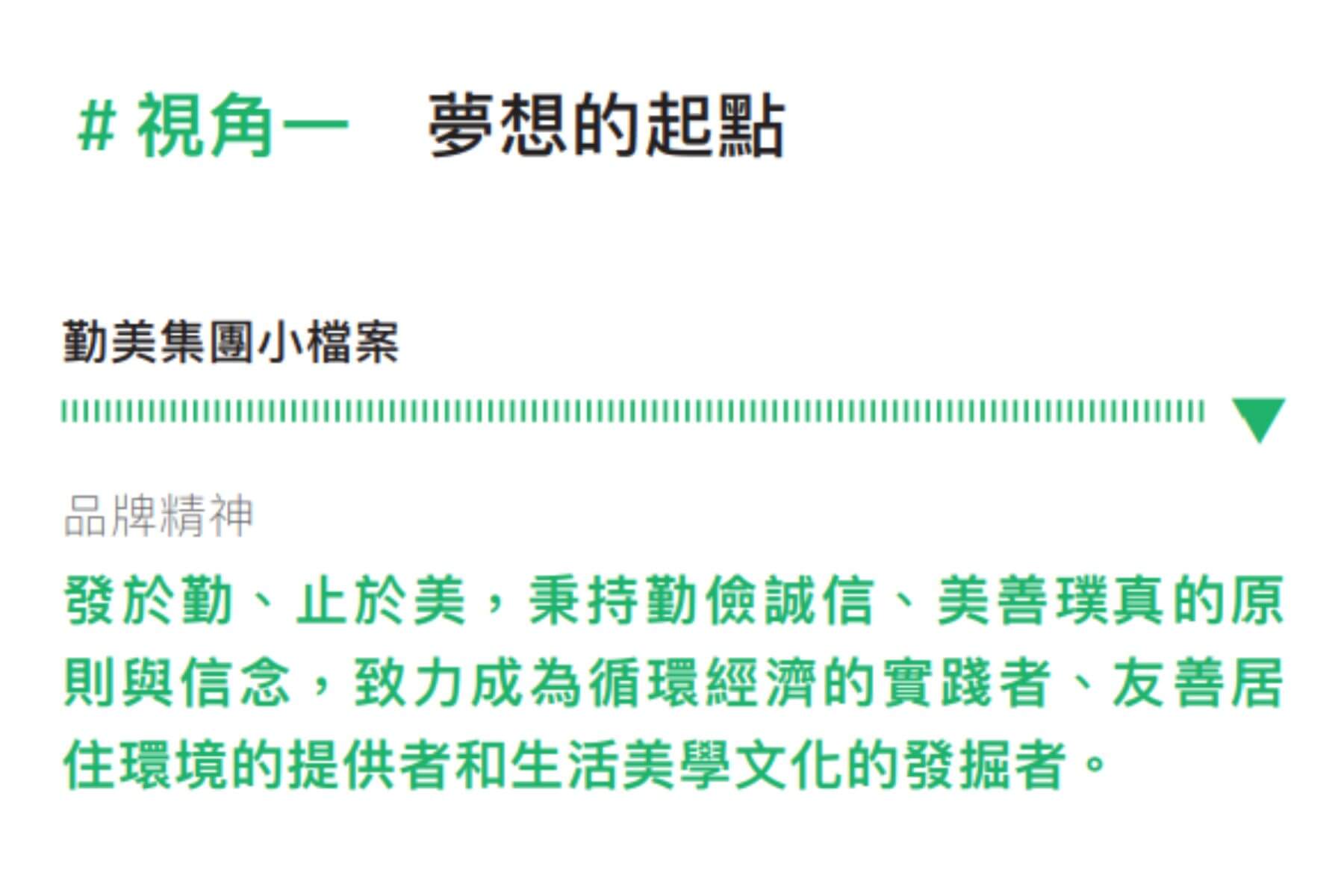 主要事業:現有金屬成型、建設住宅、生活休閒三大事業體,以及勤美璞真文化藝術基金會