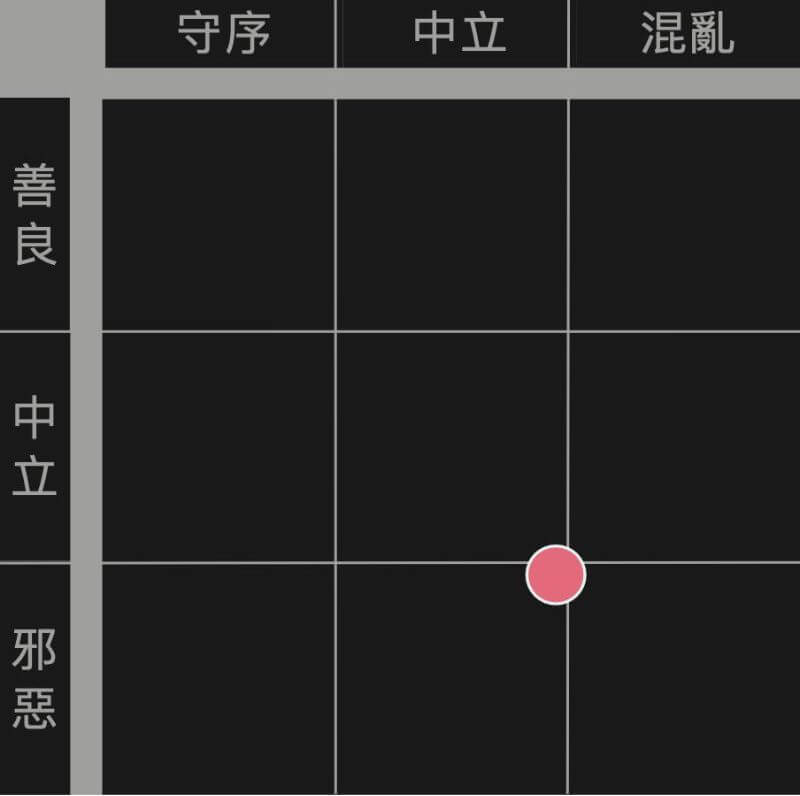 那博恩的陣營呢?他拿出一張三乘以三的陣營九宮格,他的Y軸性格幾乎落在邪惡與中立的分界,X軸立場也逼近在混亂與中立之間,就這麼踩在線與線的交叉點。踩線的性格居然也反映在心理測驗的結果?我們終究難以判斷博恩的陣營,他非邪惡、不中立,也不能算是混亂的一員。唯一能確定的大概是他與「善良」、「守序」,還真的一點也沾不上邊。