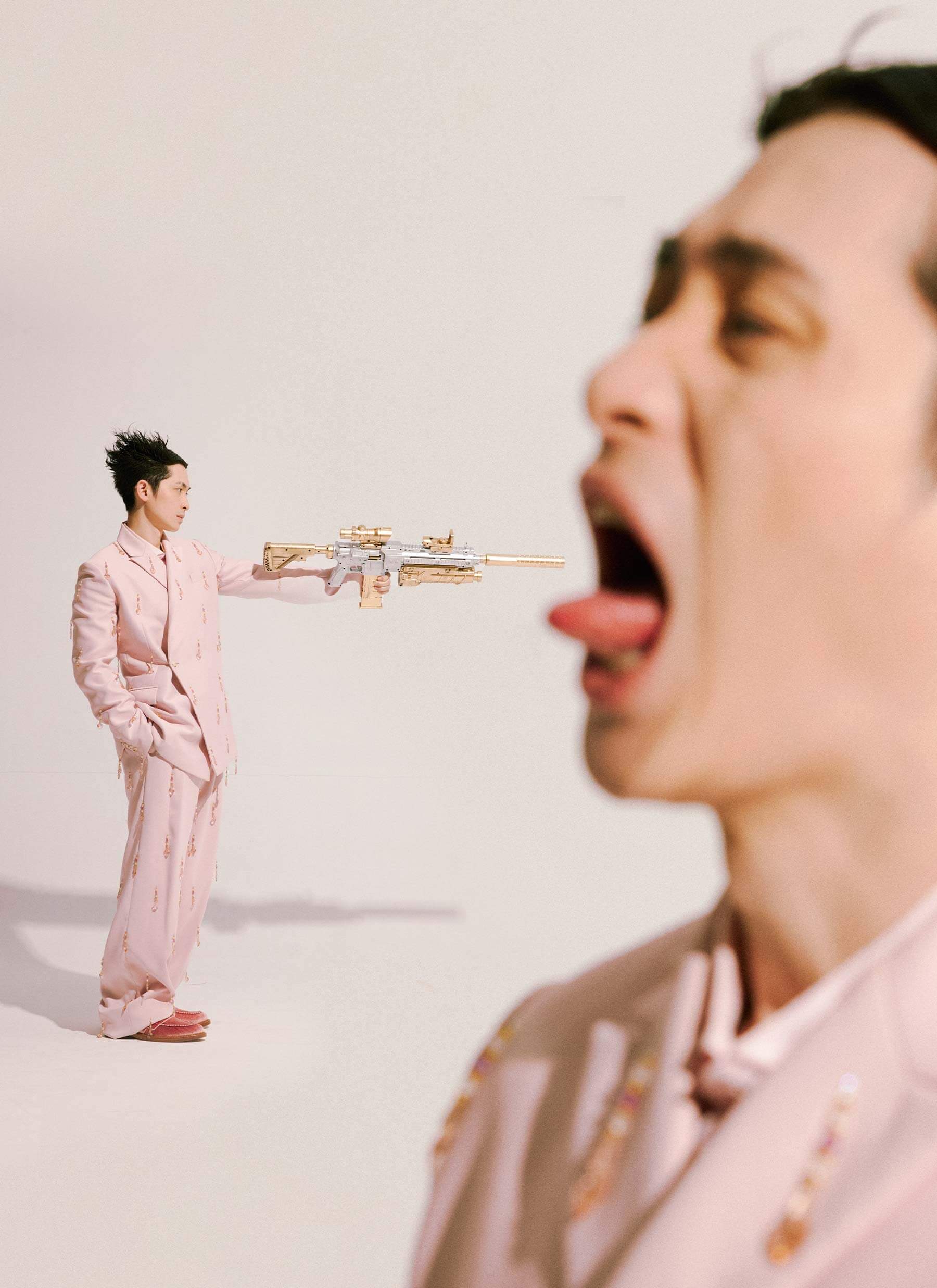 粉紅色透膚襯衫╱珠寶墜飾粉紅色西裝外套╱珠寶墜飾粉紅色西裝褲——leeshihhsun(攝影/Joshmonkey)
