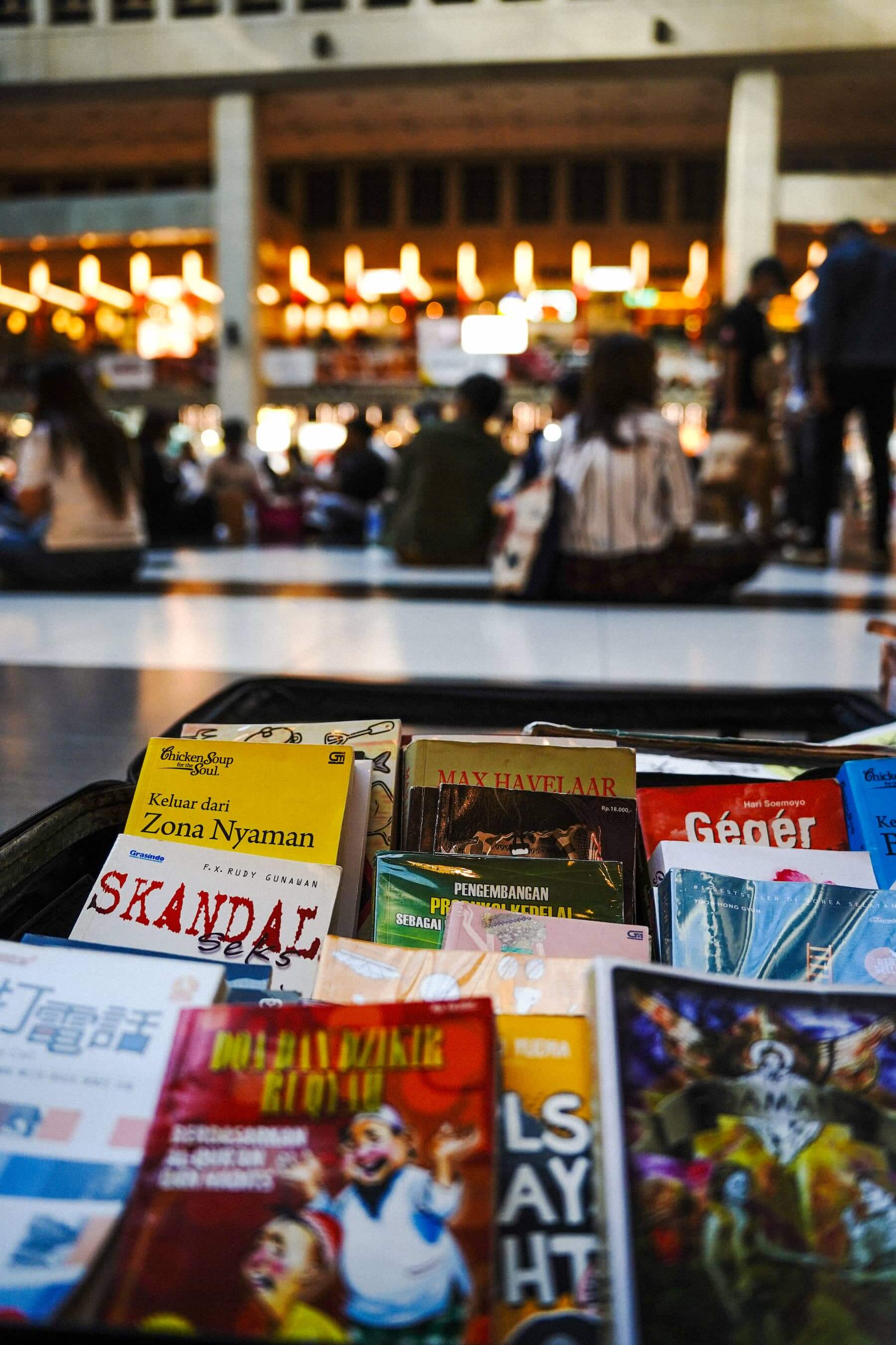 這一名為「地板圖書館」的書攤,也早從書店開幕的同年(2015)底便營運至今。為了讓書籍主動去到更多需要的人手上,在書店前專案企劃吳庭寬的提議下,每周日——多數移工唯一的週休日——下午,在北部最大的印尼移工聚集地、台北車站的大廳一角,總能看見兩個攤開的大行李箱,裡頭擺放近百本印尼語書籍,開放隨意瀏覽、借閱。