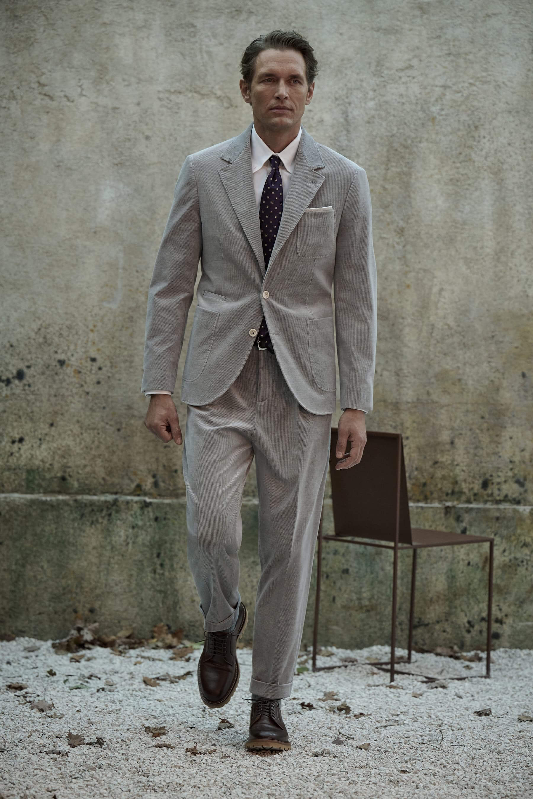 Brunello Cucinelli訂製服,嘗試以精湛義大利手工藝,捕捉男士魅力,透過裁縫師傅精湛的手藝與敏銳的眼光,精彩創作出簡約洗鍊,永恆不退流行又能符合當代潮流的經典。如同品牌追求永續時尚的理念,在力求完美的同時,將哲思與人文主義,注入時裝的美好設計之中。