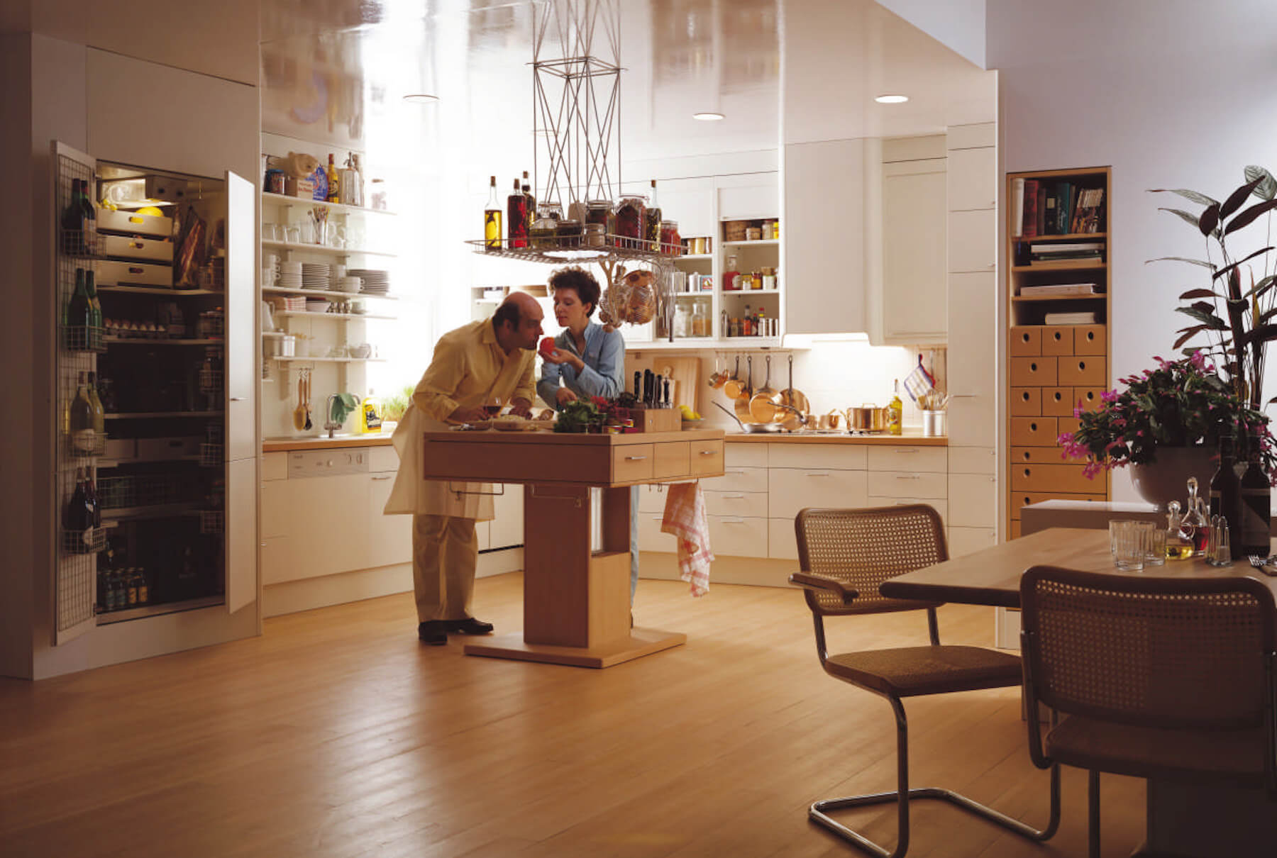 bulthaup以中島工作檯作為廚房中心,打破廚房與其他生活空間的樊籬,不再讓主婦獨自面壁煮食,而是邀請家人及親友圍聚在中島一起烹飪、品嚐、互動及對話,共享充滿歡聲笑語的生活時光。中島式廚房重新定義了當代廚房,廚房從此不再只是家屋的附屬空間,而成為一個連結情感並共創美好回憶的生活場域。