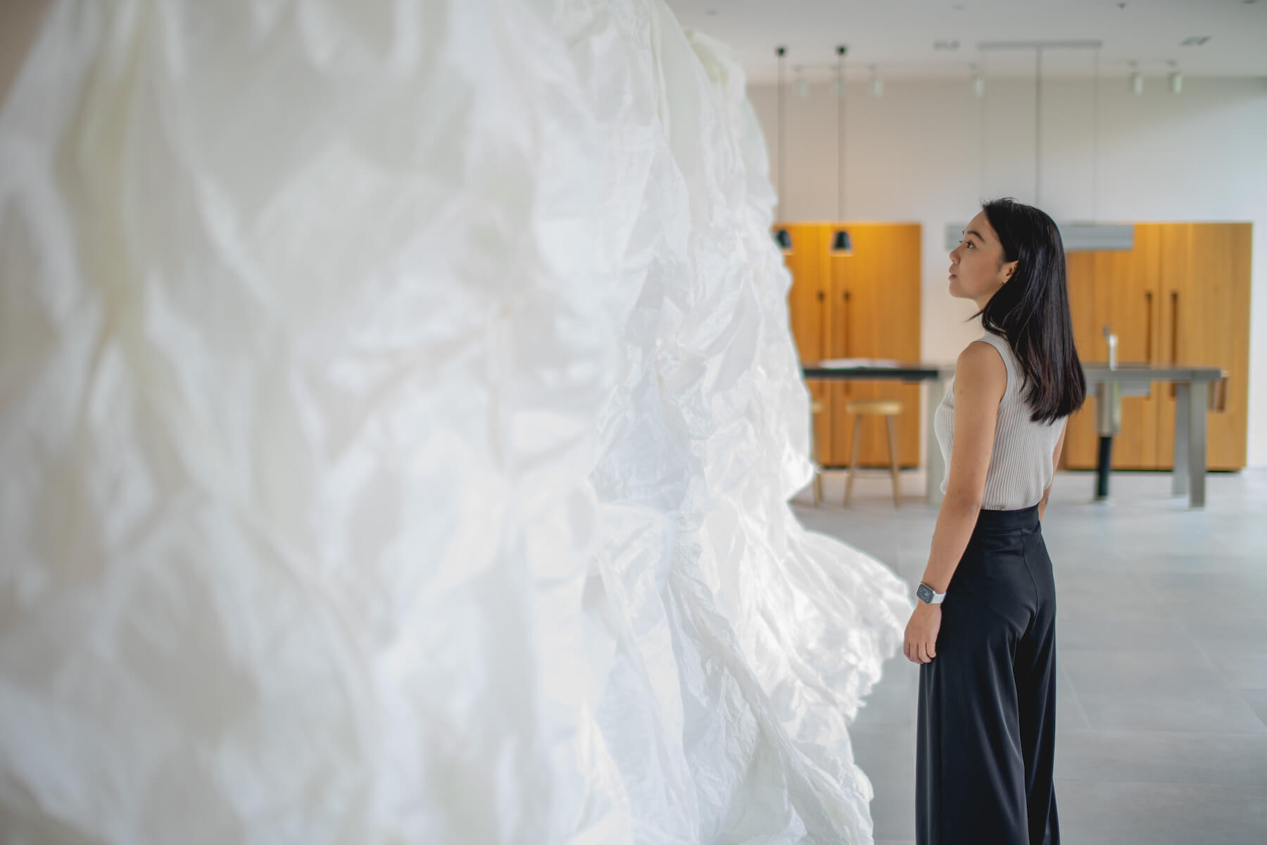 「Fenko 鳳嬌催化室」由埔里長春棉手工紙廠第三代李依耘創設,致力於以創意實驗催化出紙纖與自然材質的更多可能性。呼應bulthaup重視「本質」的理念,李依耘創作了紙的裝置藝術作品《凝聚》,只見米白紙纖化身一座大型裝置,詮釋了需無數靈感及嘗試方能積累而生的「創新 creative」。紙不加矯飾的質地、色澤、摺皺與形態,呈現的是紙材純粹的質樸樣貌,李依耘認為這即是紙材最精彩的表現,亦是她與bulthaup理念一致之處──人們需要慢下腳步,好好思考什麼是值得被珍惜保存的傳統。