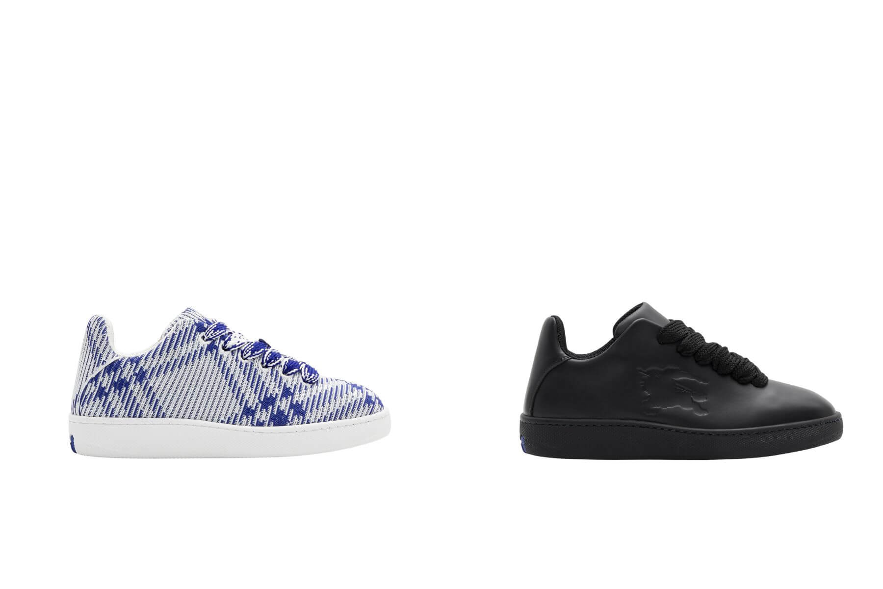 (左)Box鹽白色格紋針織運動鞋_$32,500;(右)Box黑色皮革運動鞋_$27,500 by Burberry。