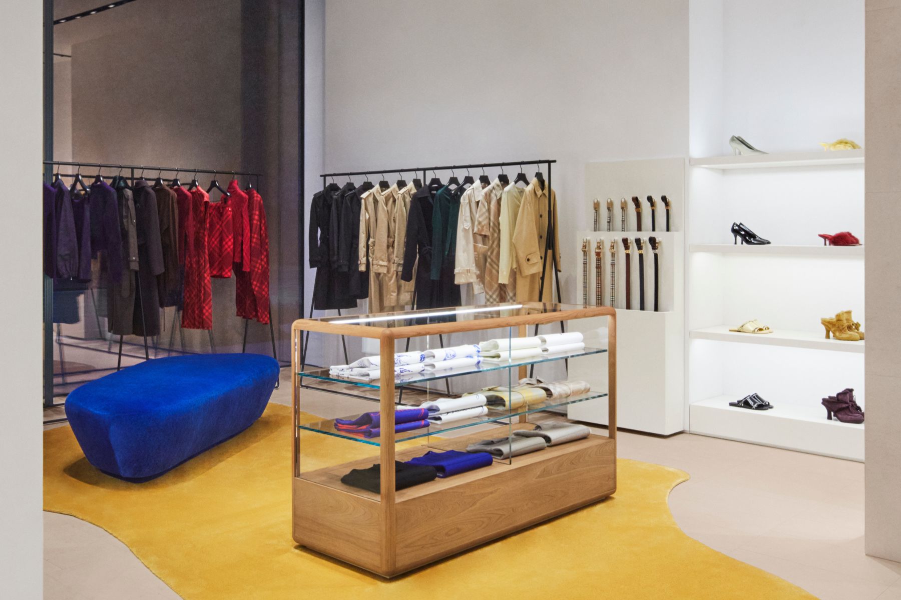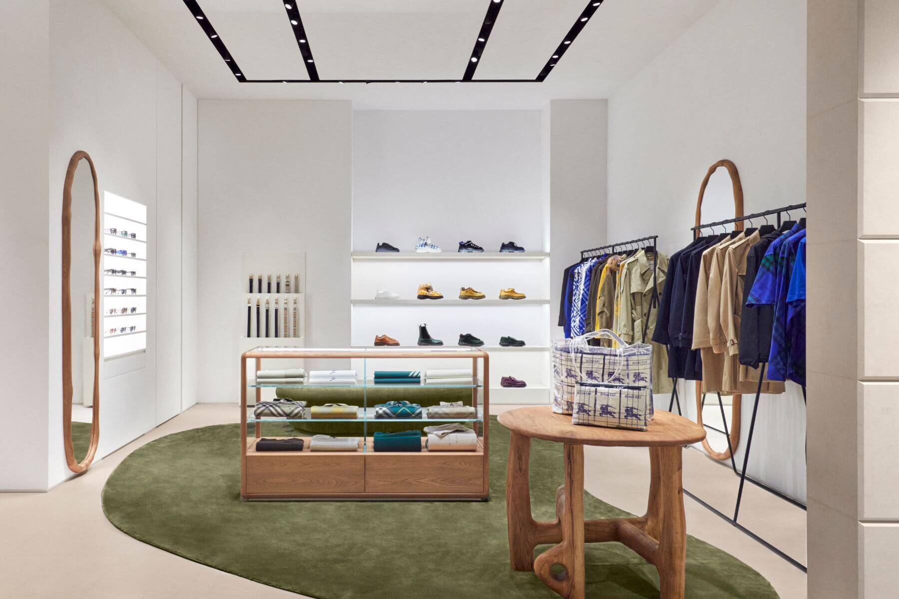 店裝比照品牌最新設計,以摩登簡約的柔和牆面與搶眼的地板配色呈現品牌全新意象,例如標誌的高飽和騎士藍沙發,或是芥末黃與藤蔓綠的地毯,皆來自Burberry最新一季的代表用色,並利用色彩的視覺體驗劃分出店內陳列空間。簡約風的木雕展示桌來自環保藝術家Casey McCafferty特別客製打造,展現Burberry對工藝的重視、堅持與承諾。