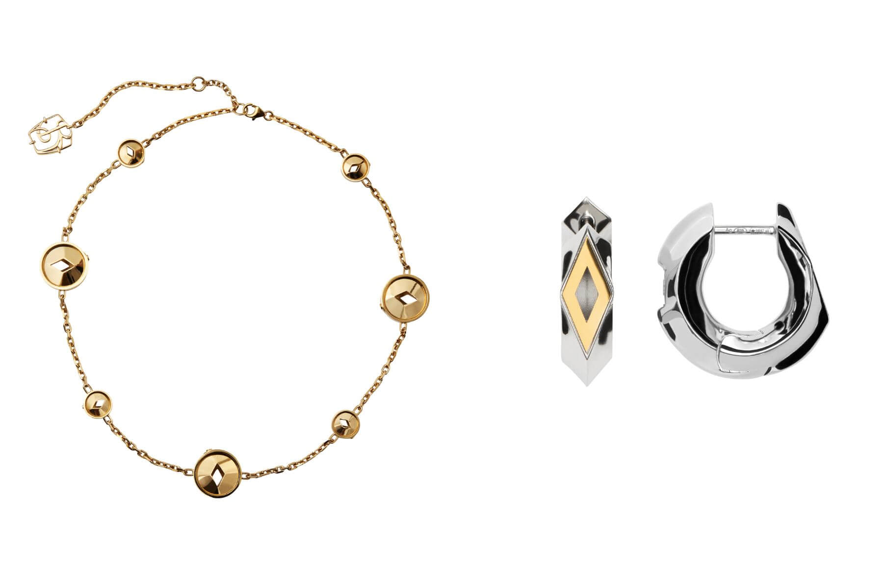 (左)Hollow純銀鍍金徽章項鍊_$55,000;(右)Hollow純銀環形耳環_$18,200 by Burberry。