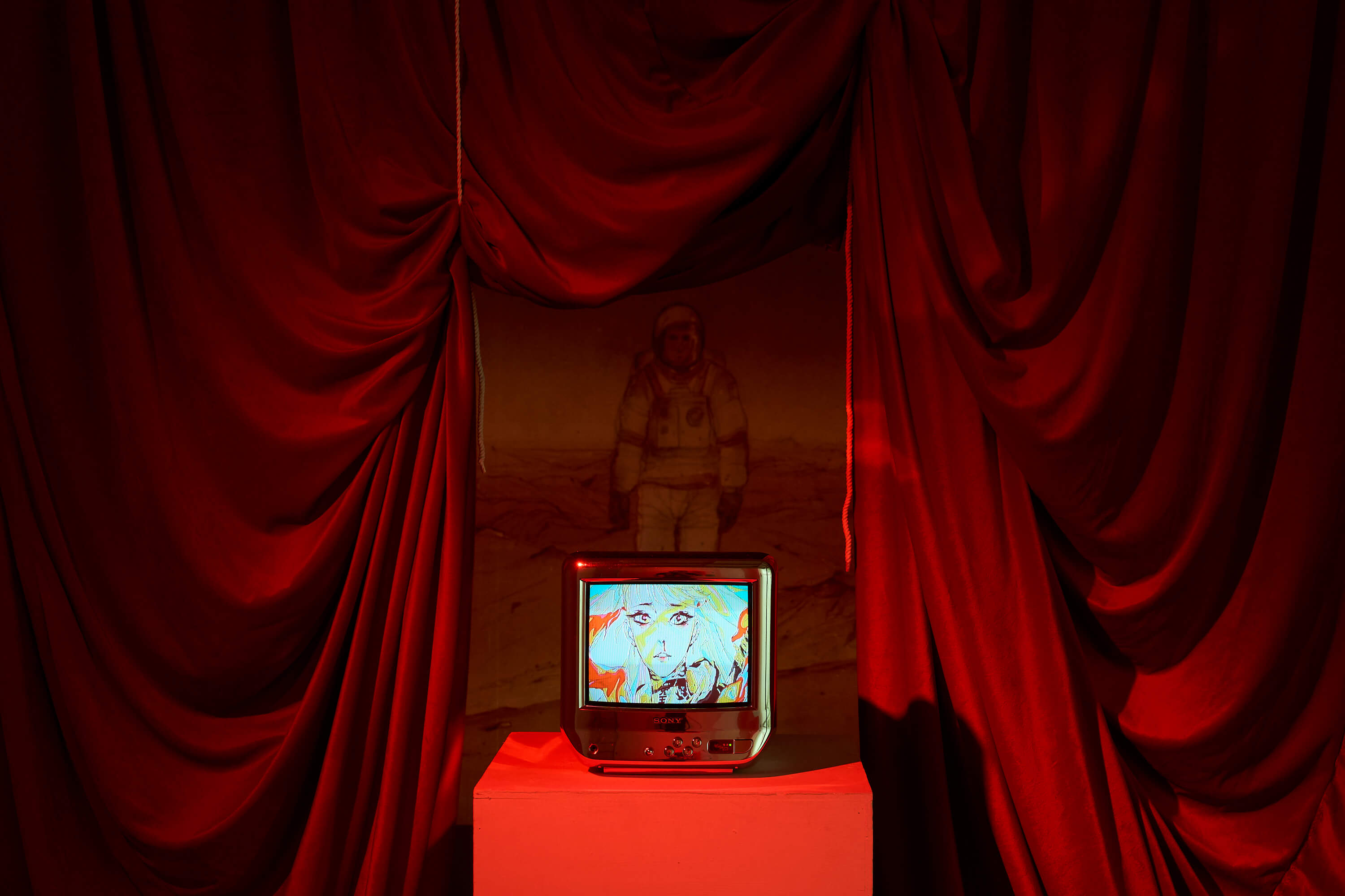 在展覽空間中,紅色成為貫穿整體的視覺語彙。紅色既像警訊,也如同血液的流動,暗示著身體內部的壓力與情緒的積累。透過紅色燈光、賽璐璐片、壓克力繪畫、動畫、投影等複合媒材的層疊配置,讓展場形成多層次的空間結構,呼應城市生活中常見的情緒如:高壓、孤寂、麻痺、逃避等,觀者如穿梭於城市不那麼光鮮亮麗的、未完工的廢墟之中。